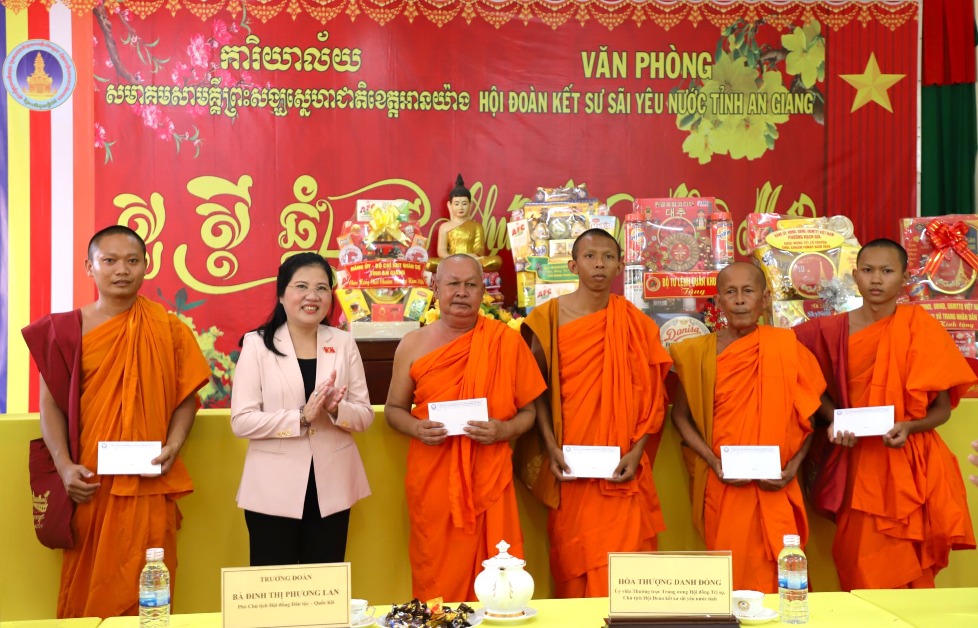 (AG Provincial E-Portal) - On the afternoon of April 14, a working delegation from the National Assembly's Council on Ethnic Affairs (CEA), led by CEA Vice Chairwoman Dinh Thi Phuong Lan, visited An Giang Province to extend traditional Chol Chnam Thmay New Year greetings. The delegation included: CEA member and full-time National Assembly (NA) deputy Leo Thi Lich; CEA member and full-time NA deputy Trang A Dương; Deputy Director of the Department of Ethnic Affairs, CEA member Nguyen Vu Thao; and Principal Specialist of the Department of Ethnic Affairs, CEA member Do Van Thanh Cong.