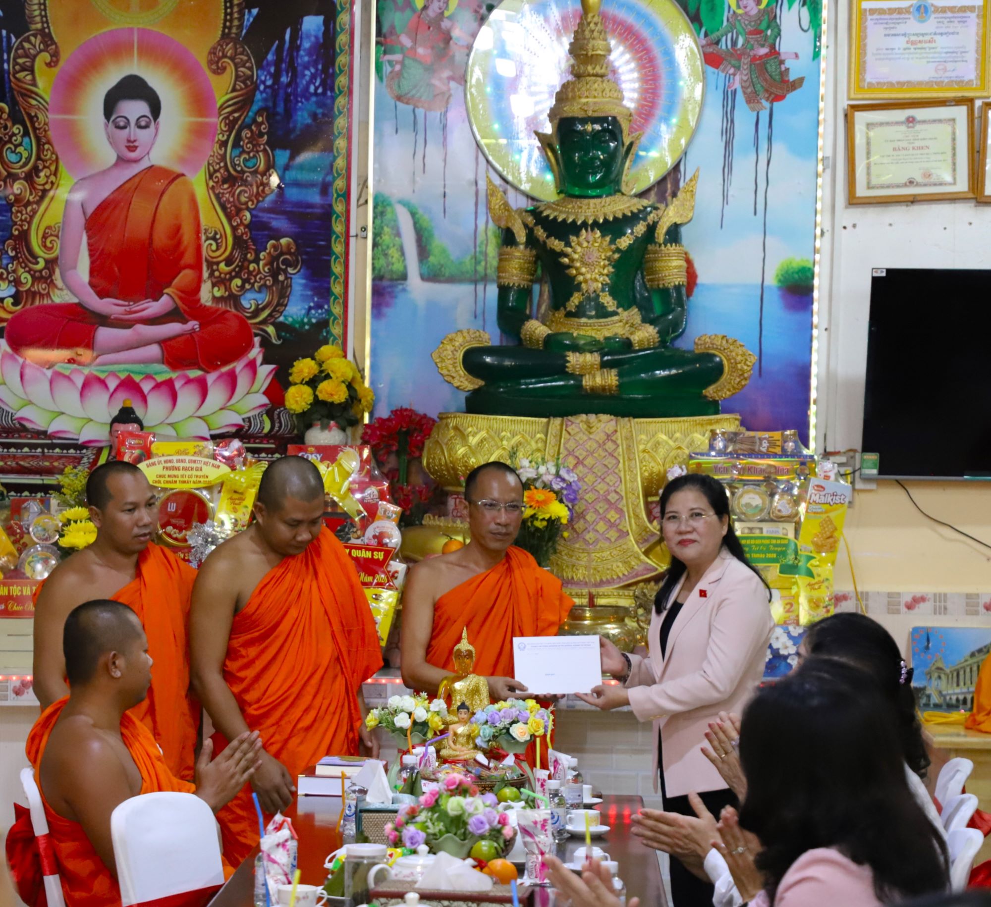 During the visits to the pagodas, CEA Vice Chairwoman Dinh Thi Phuong Lan shared that, in the vibrant atmosphere as nature transforms during these April days, she was very happy and moved to be there with the elders, monks, and all local residents to celebrate the traditional Chol Chnam Thmay New Year, a festival imbued with sacred, joyful, and lively significance for the Khmer people, to pray for favorable weather, for blessings and good fortune, and to express gratitude to the Buddha, ancestors, and parents, wishing for good health, happiness, and success in all endeavors in the new year. On behalf of the leadership of the Council on Ethnic Affairs, CEA Vice Chairwoman Dinh Thi Phuong Lan extended warm sentiments, cordial regards, and best New Year wishes for peace and prosperity to the Association of Patriotic Buddhist Monks, the Most Venerables, Venerables, senior monks, the Achars, the Pagoda Management Board, and all Khmer compatriots.