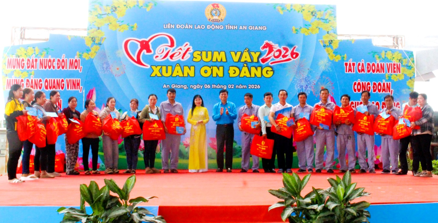 Tại chương trình, Liên đoàn Lao động tỉnh An Giang tặng 300 phần quà cho các công nhân, người lao động có hoàn cảnh khó khăn trên địa bàn, mỗi phần quà trị giá 1 triệu đồng (gồm quà và tiền mặt). Công nhân, người lao động hòa mình vào không khí sôi nổi của các tiết mục văn nghệ mừng Đảng - mừng Xuân, tham gia nhiều trò chơi dân gian.