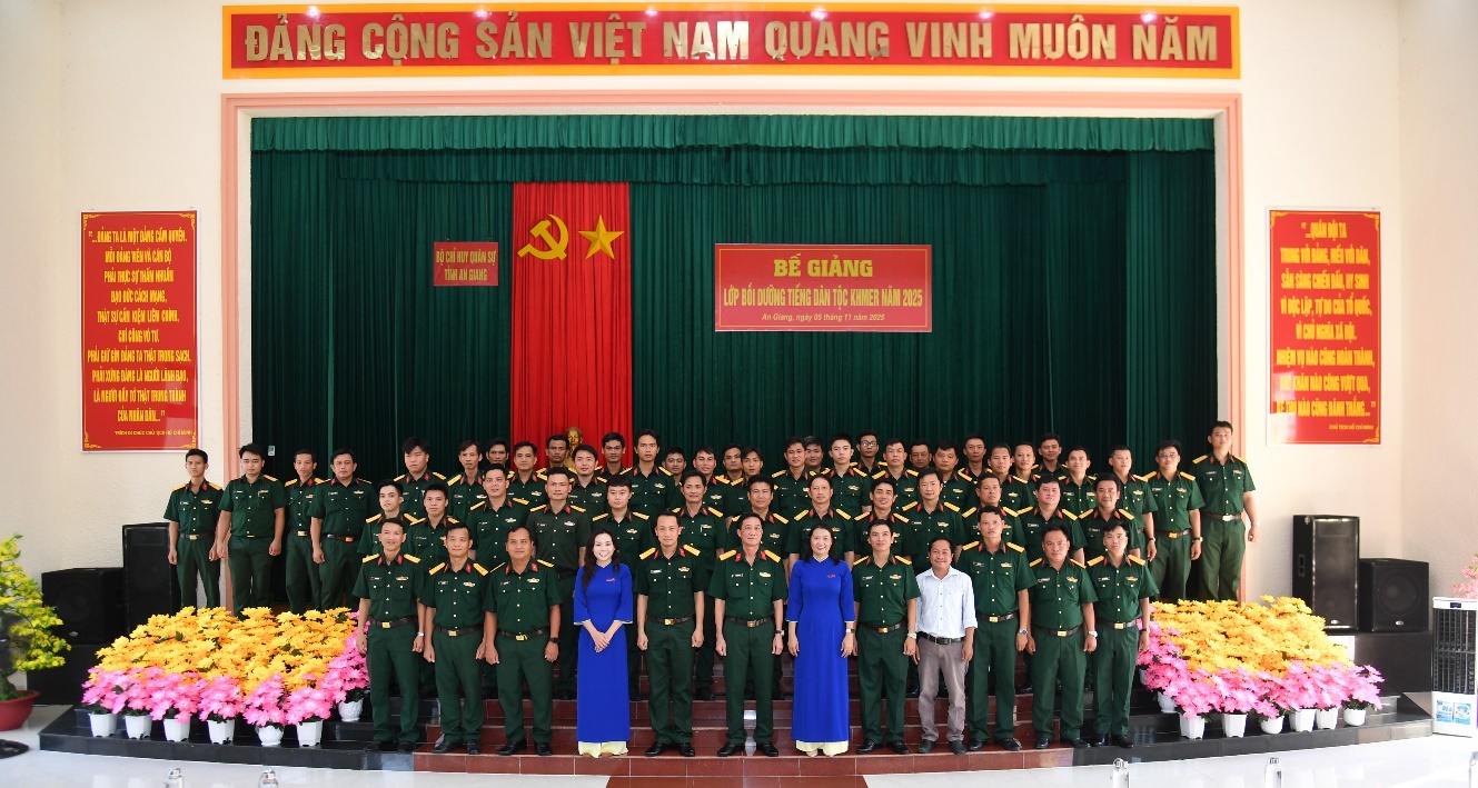 (Cổng TTĐT tỉnh AG)- Chiều ngày 05/11, Bộ CHQS tỉnh An Giang phối hợp với Trường Đại học Trà Vinh tổ chức bế giảng lớp bồi dưỡng tiếng Khmer năm 2025. Đại tá Cao Minh Tâm, Phó Chính ủy Bộ CHQS tỉnh tham dự buổi lễ.