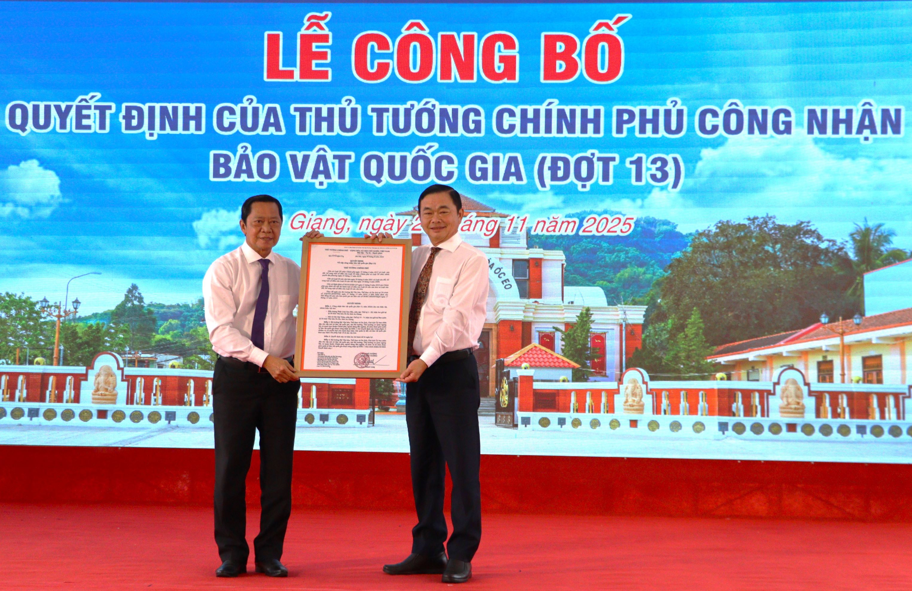 Tại buổi lễ, Sở Văn hóa và Thể thao công bố Quyết định của Thủ tướng Chính phủ công nhận bảo vật quốc gia (đợt 13) năm 2024 của tỉnh An Giang, gồm: Đầu tượng Phật Linh Sơn Bắc, niên đại thế kỷ I - III và Mộ vò Gò Cây Trâm, niên đại thế kỷ IV - V, hiện đang lưu giữ tại Ban Quản lý Di tích Văn hóa Óc Eo tỉnh An Giang.