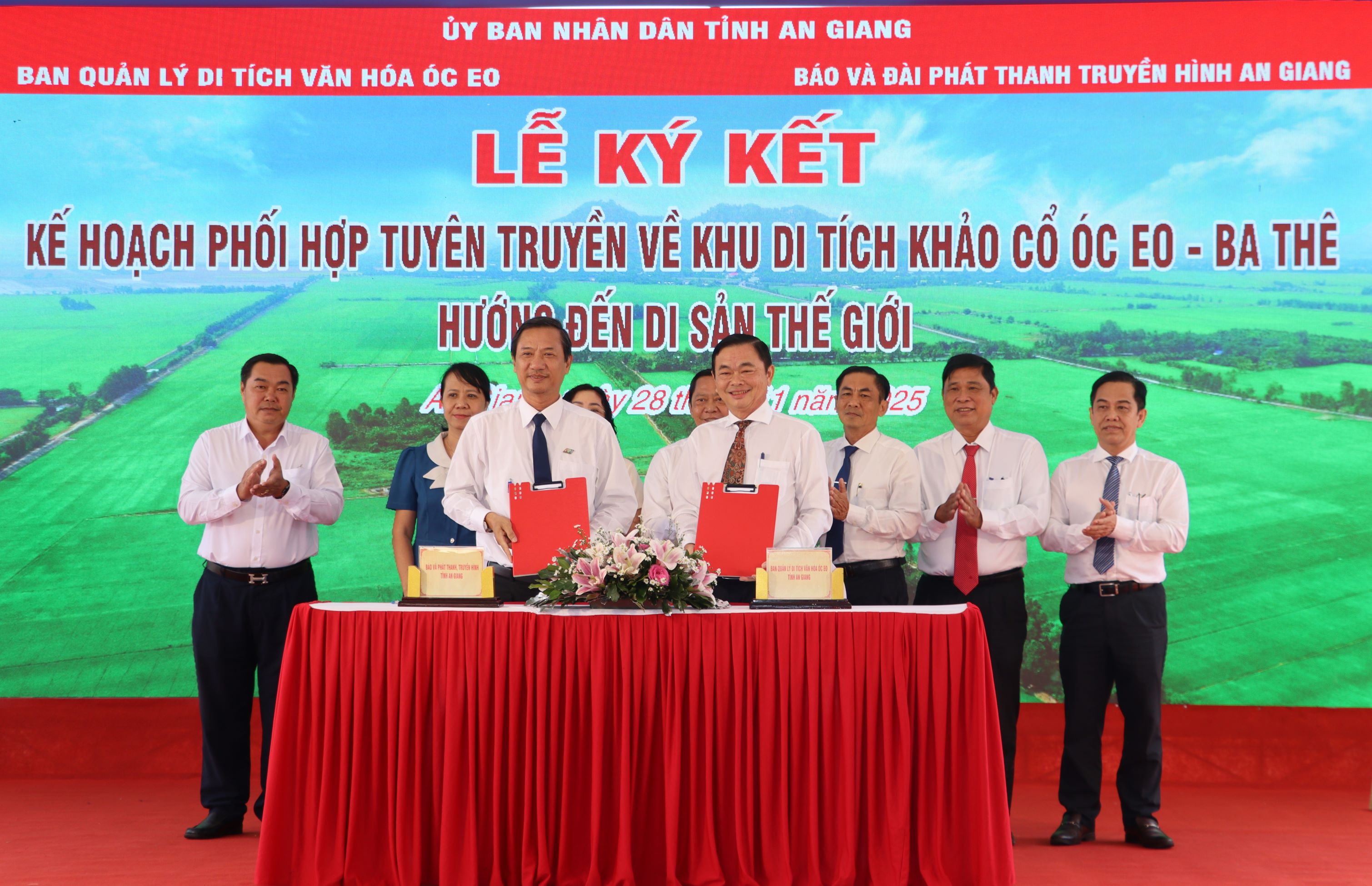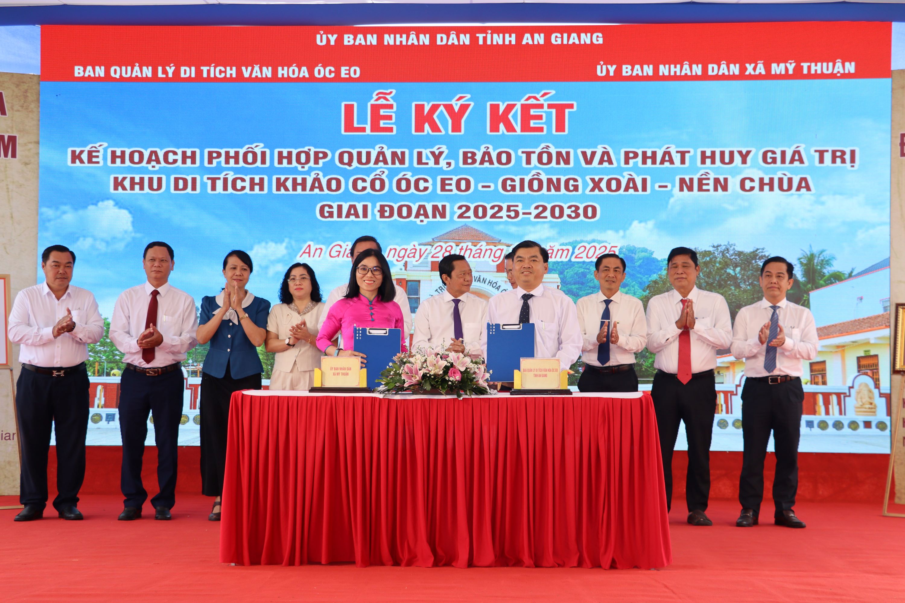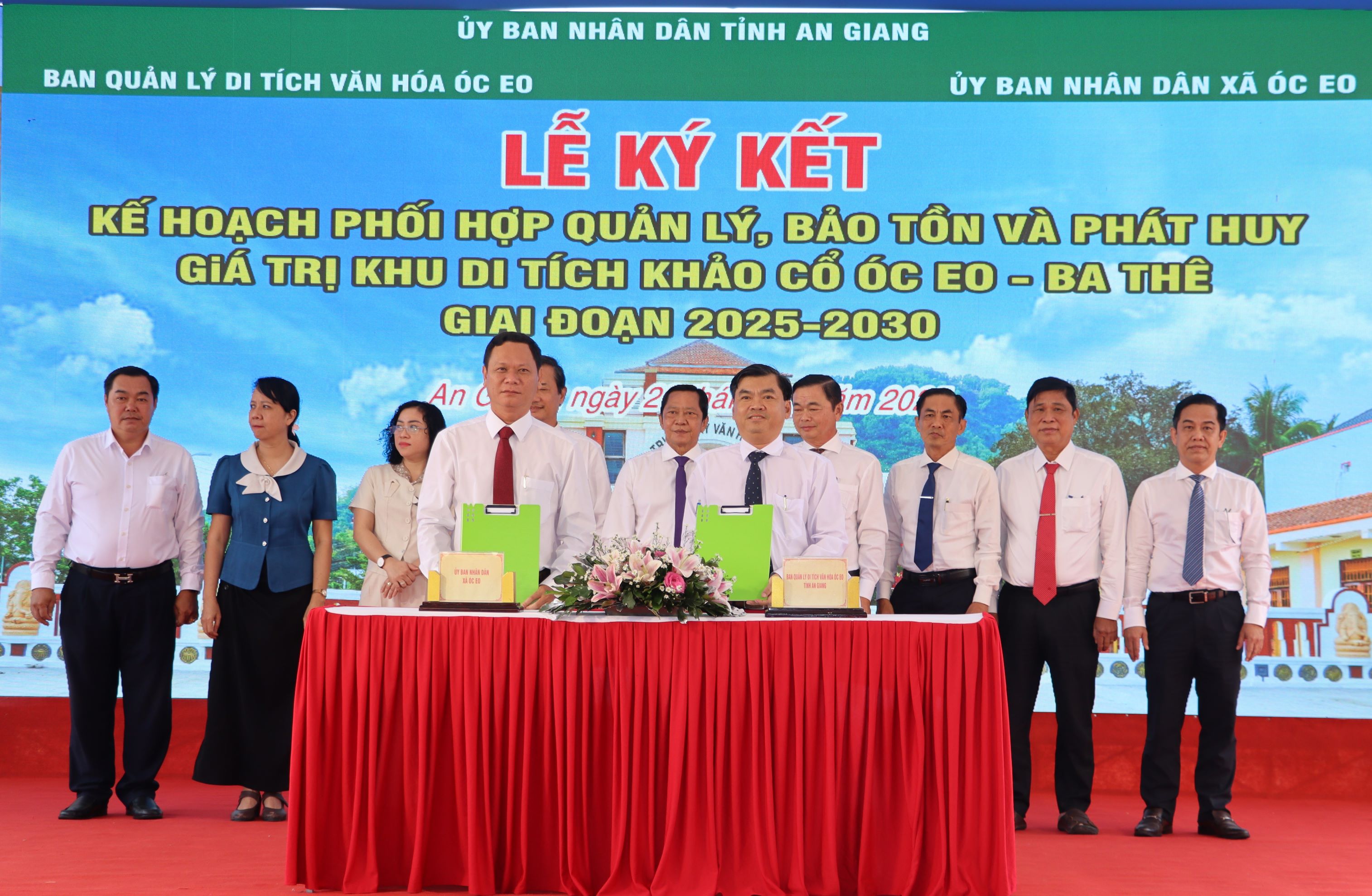 Tại buổi lễ, Ban Quản lý Di tích Văn hóa Óc Eo đã ký kết hợp tác tuyên truyền văn hóa Óc Eo giai đoạn 2025 - 2030 với Báo và Phát thanh - Truyền hình An Giang; ký kết hợp tác phối hợp quản lý, bảo tồn phát huy giá trị di tích văn hóa Óc Eo tại Khu Di tích khảo cổ Óc Eo - Ba Thê với UBND xã Óc Eo; ký kết hợp tác phối hợp quản lý, bảo tồn phát huy giá trị di tích văn hóa Óc Eo tại di tích Giồng Xoài, Nền Chùa với UBND xã Mỹ Thuận.