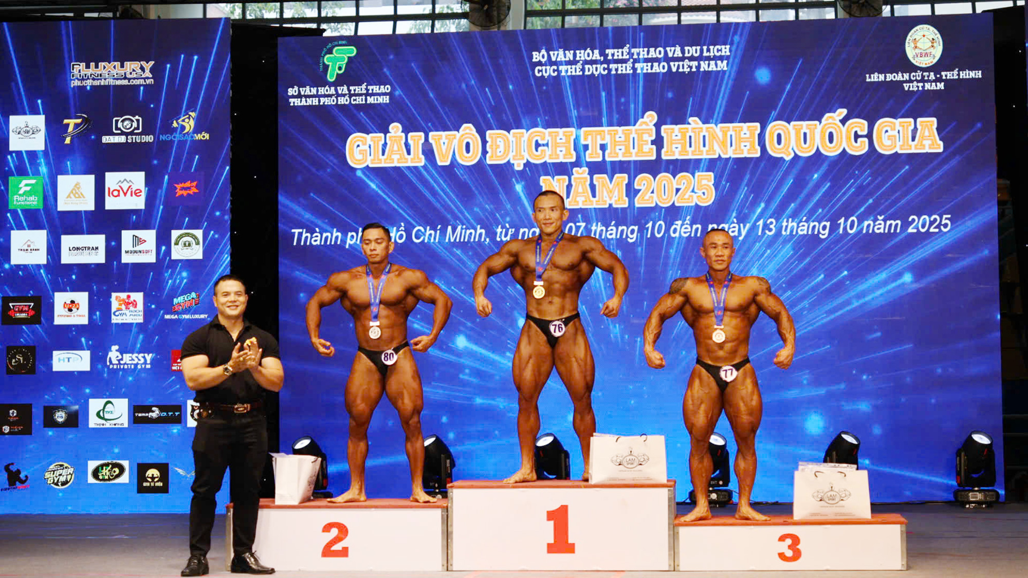 Các vận động viên đoạt huy chương vàng gồm: Phạm Văn Mách nội dung thể hình đơn nam hạng cân đến 60kg; Lê Hoài Thương nội dung thể hình đơn nam đến 70kg; Đinh Thị Kim An – Lê Hoài Thương nội dung thể hình đôi nam nữ đến 46kg; Tô Lan Nhi nội dung fitness nữ đến 160cm.