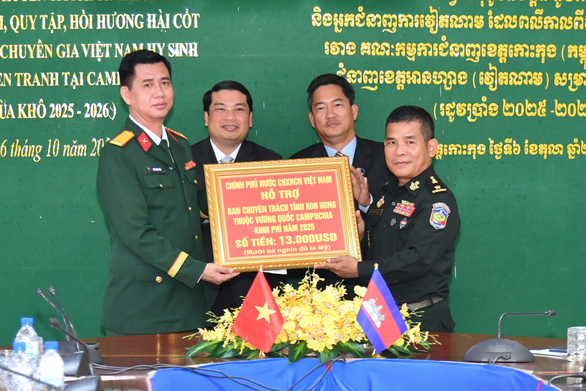 Dịp này, Ban Chuyên trách tỉnh An Giang đã trao kinh phí của Chính phủ Nước Cộng hòa Xã hội Chủ nghĩa Việt Nam hỗ trợ Ban Chuyên trách tỉnh Koh Kong trong công tác phối hợp tìm kiếm, quy tập, hồi hương hài cốt liệt sĩ Quân tình nguyện và Chuyên gia Việt Nam hy sinh trong các thời kỳ chiến tranh tại Campuchia trên địa bàn tỉnh Koh Kong. Đồng thời, trao tặng những phần quà bày tỏ lòng biết ơn chân thành, tình cảm cao đẹp, sự giúp đỡ và tạo mọi điều kiện thuận lợi của chính quyền, lực lượng vũ trang và Nhân dân tỉnh Koh Kong giúp cho Ban Chuyên trách và Đội K92, Bộ Chỉ huy Quân sự tỉnh An Giang hoàn thành tốt nhiệm vụ trong thời gian qua./.