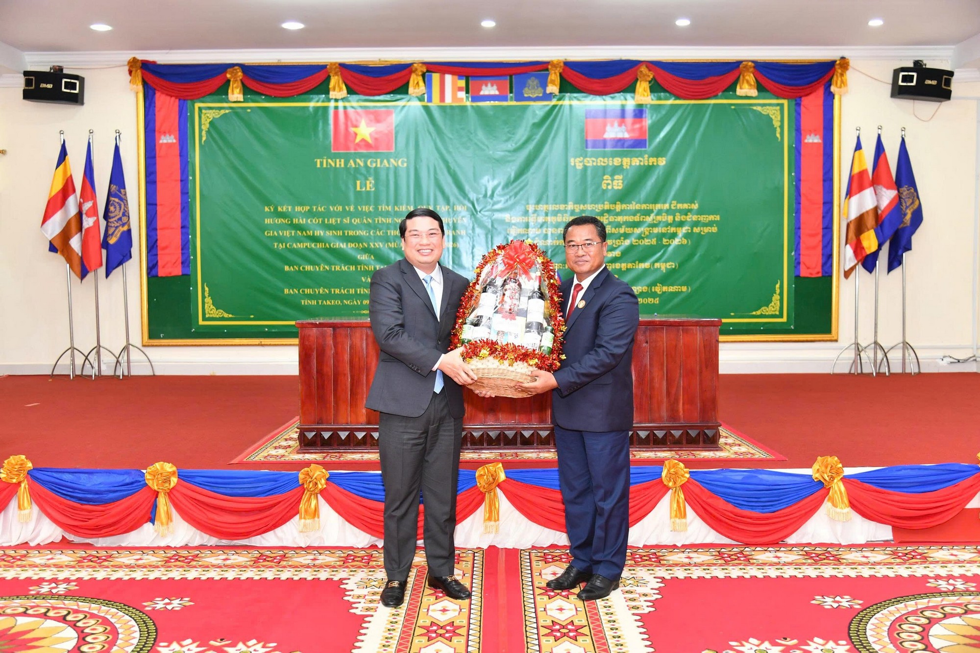 Phát biểu tại buổi lễ, ngài Sut Khon - Phó Tỉnh trưởng, Trưởng Ban Chuyên trách tỉnh Takeo vui mừng chào đón đoàn đại biểu tỉnh An Giang đến tổ chức lễ ký kết; đồng thời đánh giá cao thời gian qua hai tỉnh Takeo - An Giang đã hợp tác tìm kiếm, quy tập, hồi hương hài cốt liệt sĩ quân tình nguyện và chuyên gia Việt Nam hy sinh trong các thời kỳ chiến tranh tại Campuchia trên địa bàn tỉnh Takeo đạt nhiều kết quả.