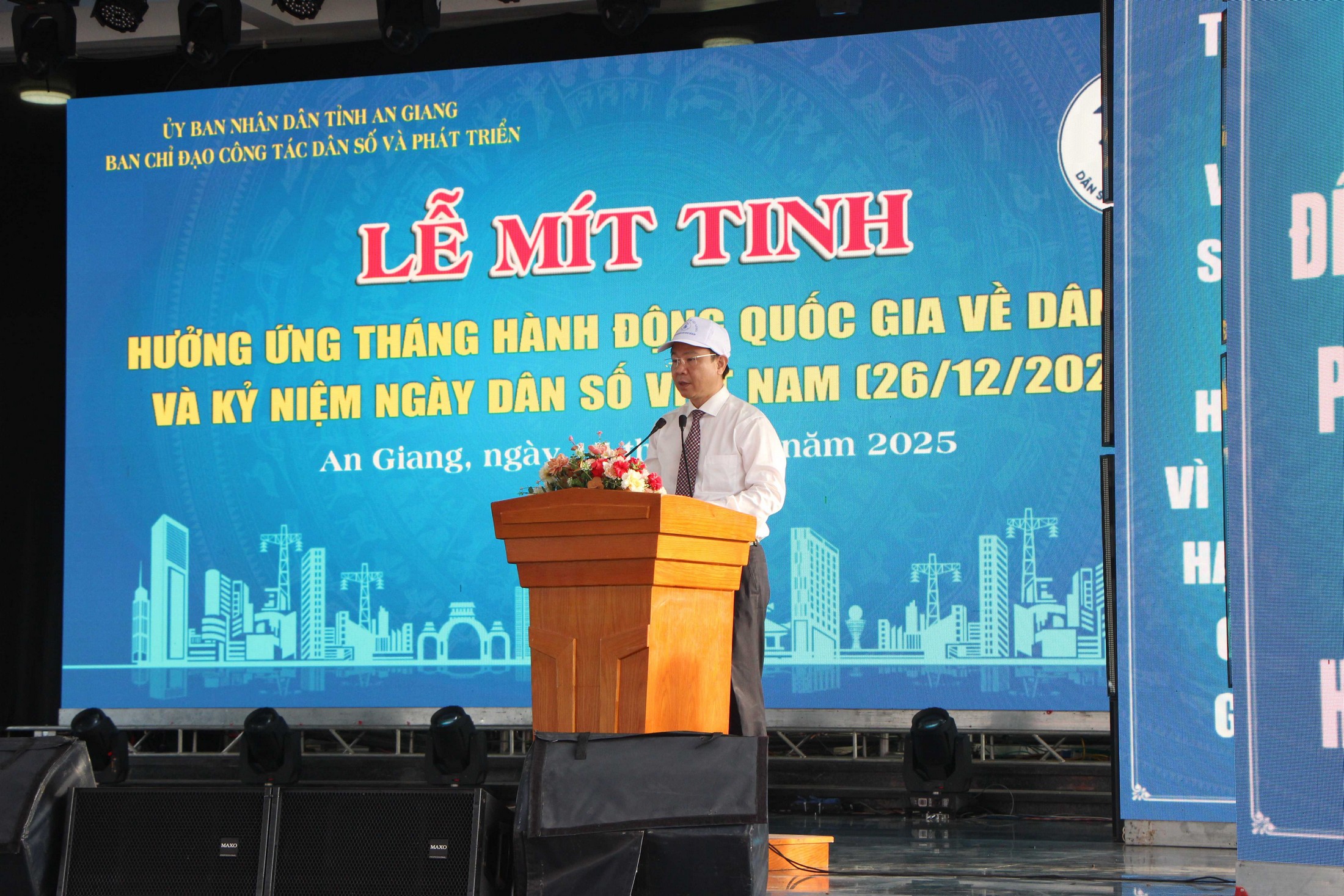 Phát biểu hưởng ứng lễ phát động PGS.TS.BS Trần Quang Hiền, Giám đốc Sở Y tế An Giang kêu gọi toàn thể cán bộ công chức, viên chức làm công tác Dân số các cấp tích cực, chủ động, sáng tạo tham mưu các cấp ủy Đảng, chính quyền. Phối hợp và huy động mọi tầng lớp nhân dân tích cực thực hiện có hiệu quả chính sách dân số và phát triển của Đảng, Nhà nước; nhất là khi Quốc hội vừa thông qua Luật Dân số vào sáng ngày 10/12 và Chương trình mục tiêu Quốc gia Y tế - Dân số giai đoạn 2026-2035.