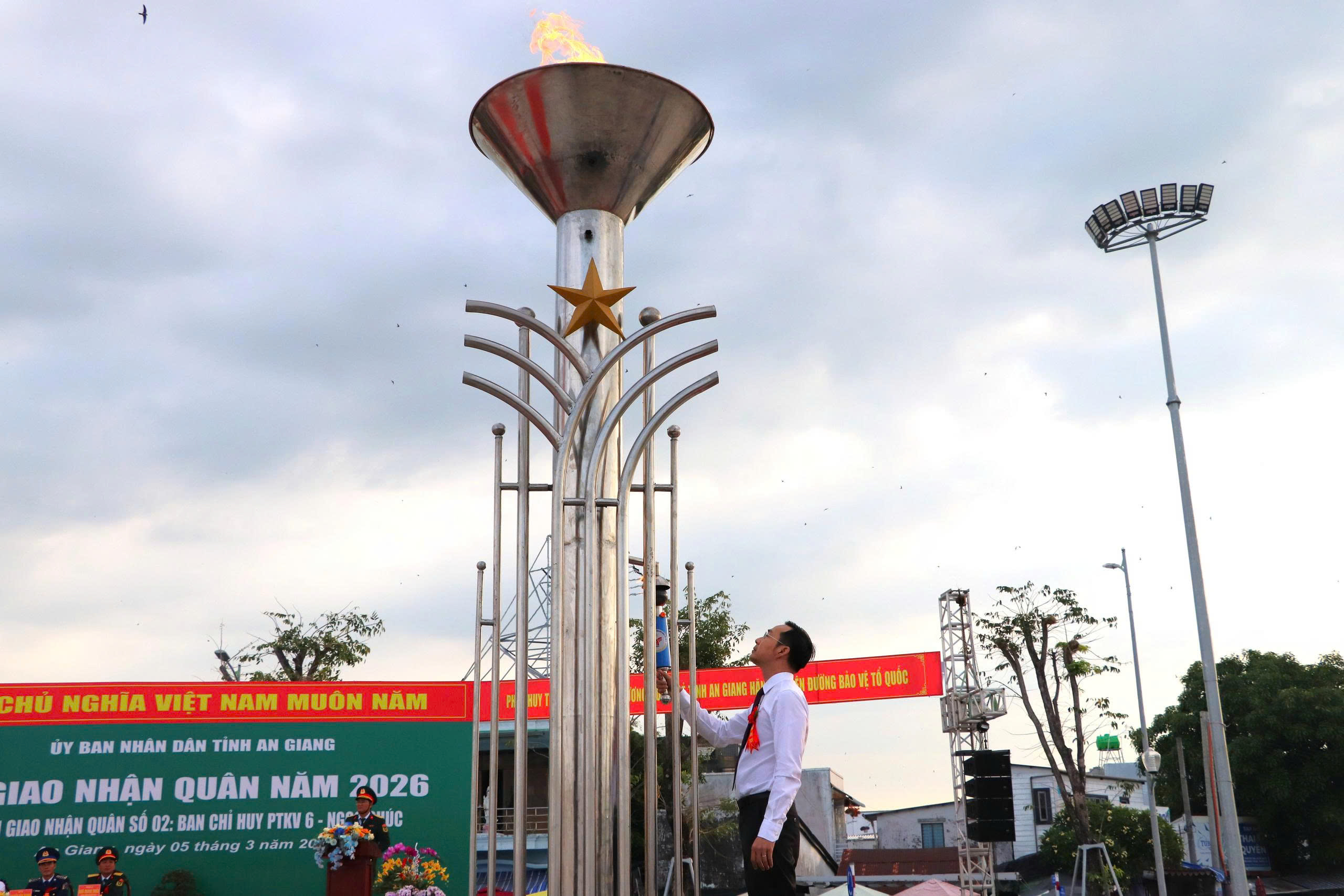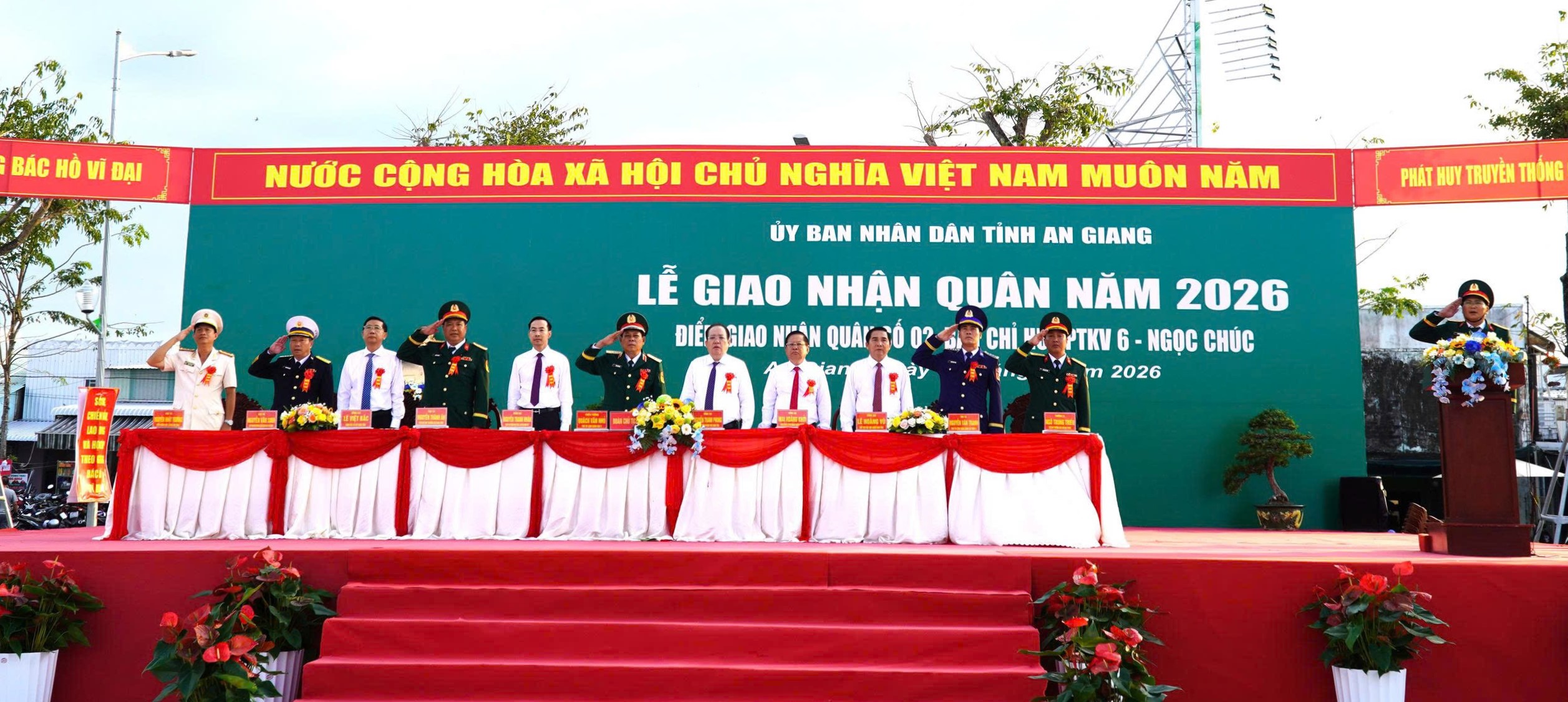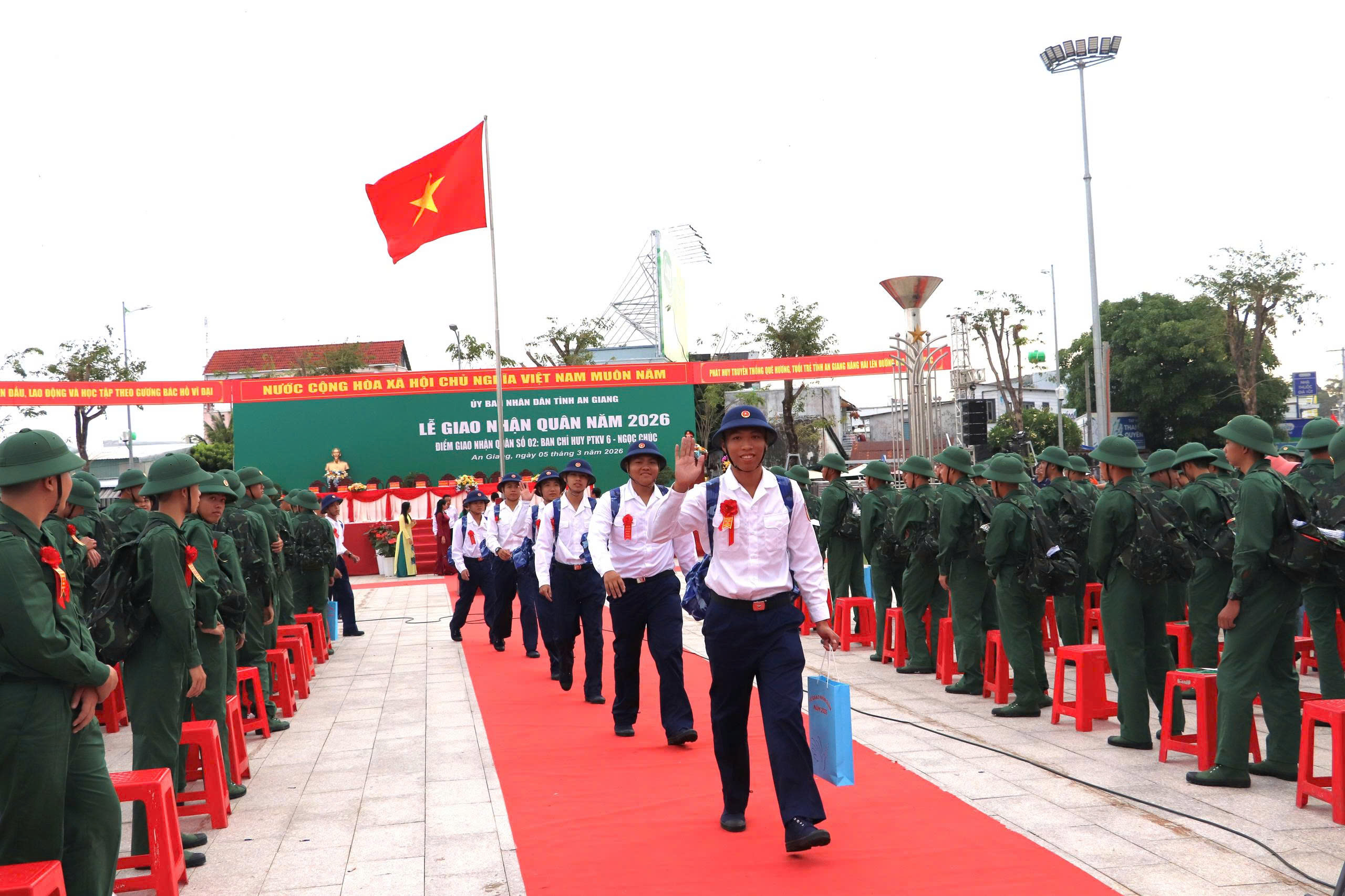 (Cổng TTĐT tỉnh AG) – Sáng 05/3, tại phường Rạch Giá, Hội đồng Nghĩa vụ Quân sự tỉnh An Giang long trọng tổ chức Lễ giao nhận quân năm 2026. Tham dự điểm giao nhận quân ở phường Rạch Giá có Thiếu tướng Quách Văn Nhỏ - Đảng ủy viên Quân khu, Phó tư lệnh quân khu 9; Phó Bí thư Thường trực Tỉnh ủy, Chủ tịch HĐND tỉnh Nguyễn Thanh Nhàn; Ủy viên Ban Thường vụ Tỉnh ủy, Phó Chủ tịch Thường trực UBND tỉnh Nguyễn Thanh Phong; Ủy viên Ban Thường vụ Tỉnh ủy, Bí thư Đảng ủy phường Rạch Giá Mai Hoàng Khởi cùng lãnh đạo, chỉ huy Bộ Chỉ huy Quân sự tỉnh, Công an tỉnh, Ủy ban MTTQ Việt Nam tỉnh, Bộ tư Lệnh vùng 4 Cảnh sát biển 4, Bộ Tư lệnh vùng 5 Hải quân, Ban Chỉ Huy Phòng thủ khu vực 6 – Ngọc Chúc.