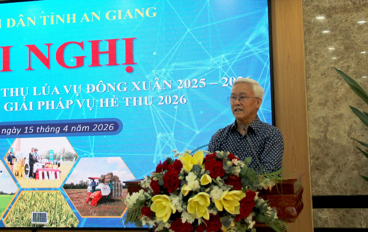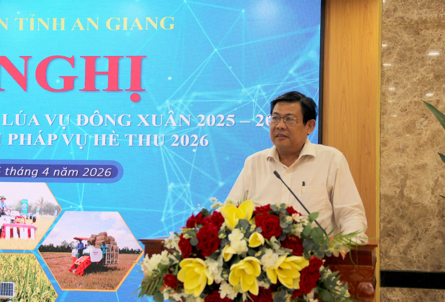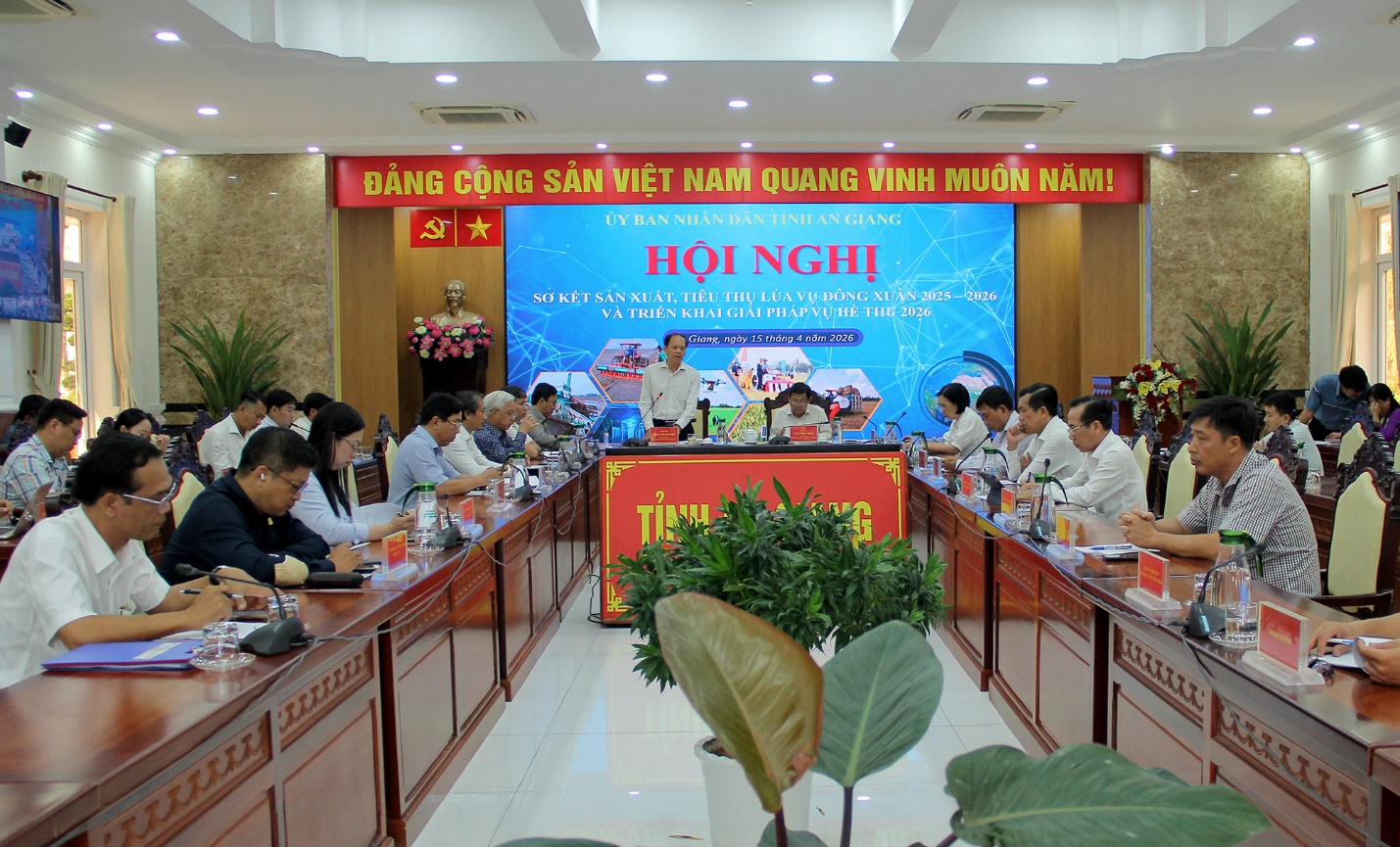 (Cổng TTĐT tỉnh AG)-Sáng 15/4, Phó Chủ tịch UBND tỉnh An Giang Ngô Công Thức chủ trì Hội nghị về Sơ kết sản xuất, tiêu thụ lúa vụ Đông Xuân 2025 - 2026 và triển khai giải pháp vụ Hè Thu 2026; Tham dự và cùng chủ trì có Phó Giám đốc Sở Nông nghiệp và Môi trường Trần Thanh Hiệp. Hội nghị được tổ chức dưới hình thức trực tiếp kết hợp trực tuyến.
