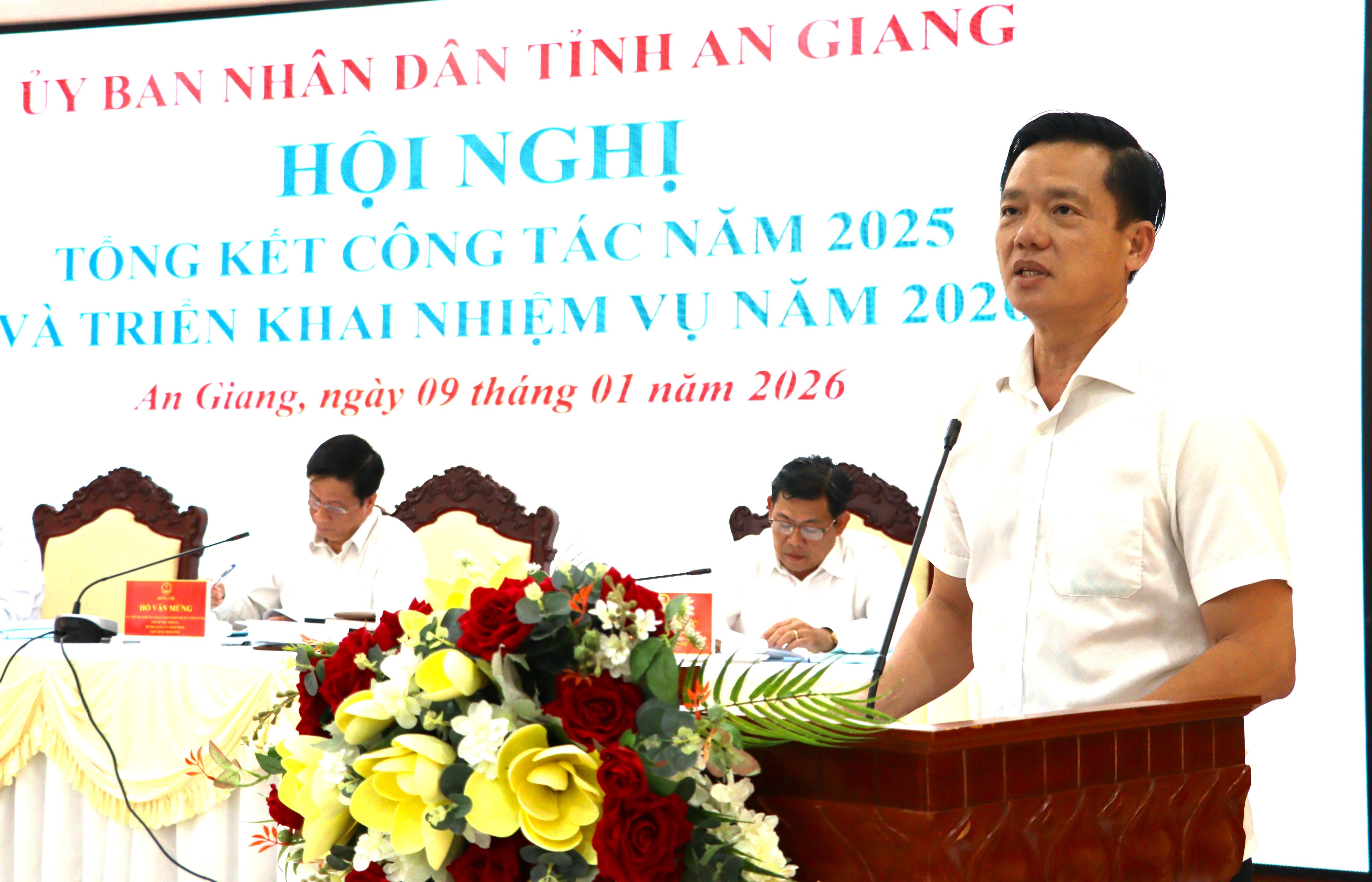 (Cổng TTĐT tỉnh AG) - Chiều 9/01, UBND tỉnh tổ chức Hội nghị Tổng kết công tác năm 2025, triển khai giao chỉ tiêu, nhiệm vụ công tác năm 2026 bằng hình thức trực tiếp kết hợp trực tuyến. Ủy viên Ban Chấp hành Trung ương Đảng, Bí thư Tỉnh ủy Nguyễn Tiến Hải dự chỉ đạo Hội nghị. Ủy viên dự khuyết Ban chấp hành Trung ương Đảng, Phó Bí thư Tỉnh ủy, Chủ tịch UBND tỉnh Hồ Văn Mừng và các Phó Chủ tịch UBND tỉnh chủ trì Hội nghị.
