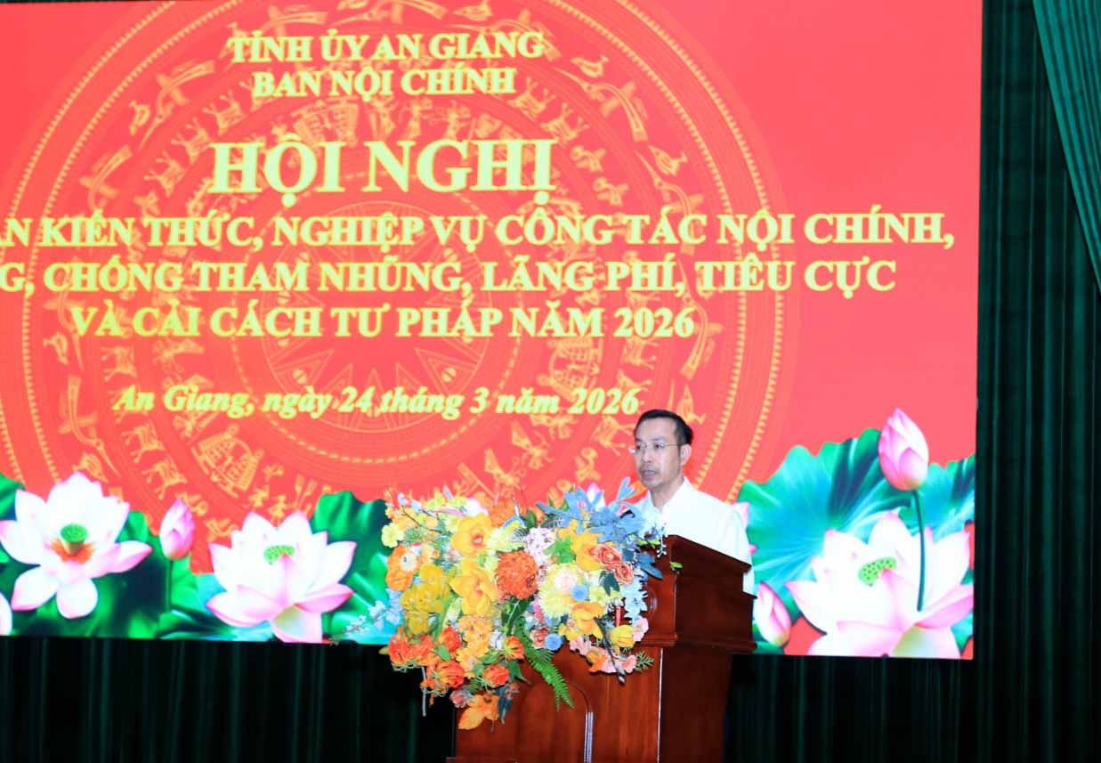 (Cổng TTĐT tỉnh AG)- Sáng 24/3, Ban Nội chính Tỉnh ủy An Giang tổ chức Hội nghị tập huấn nghiệp vụ công tác nội chính, phòng, chống tham nhũng, lãng phí, tiêu cực và cải cách tư pháp năm 2026. Dự Hội nghị có Phó Vụ trưởng Vụ Địa phương III, Ban Nội chính Trung ương Trịnh Thăng Quyết; Phó Bí thư Thường trực Tỉnh ủy, Chủ tịch HĐND tỉnh An Giang Nguyễn Thanh Nhàn.
