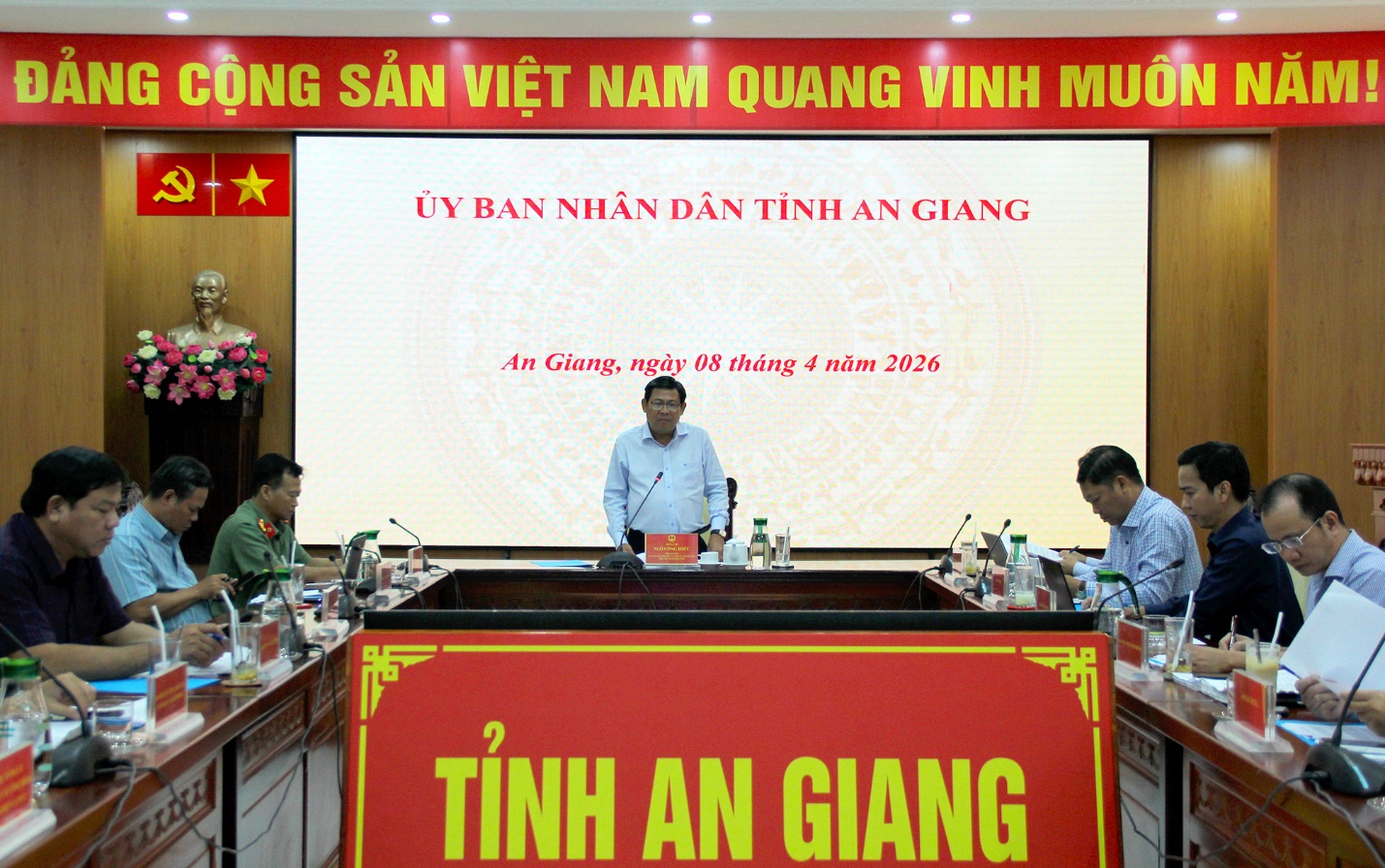 (Cổng TTĐT tỉnh AG)- Chiều 08/4, Phó Chủ tịch Ủy ban nhân dân tỉnh Ngô Công Thức chủ trì buổi họp về tình hình khai thác, cung cấp, sử dụng, phân bổ, thu hồi nguyên vật liệu xây dựng, bố trí bãi thải trên địa bàn tỉnh phục vụ công trình APEC 2027 tại Phú Quốc, công trình trên đảo Thổ Chu, các công trình trọng điểm và các công trình đầu tư công trên địa bàn tỉnh.