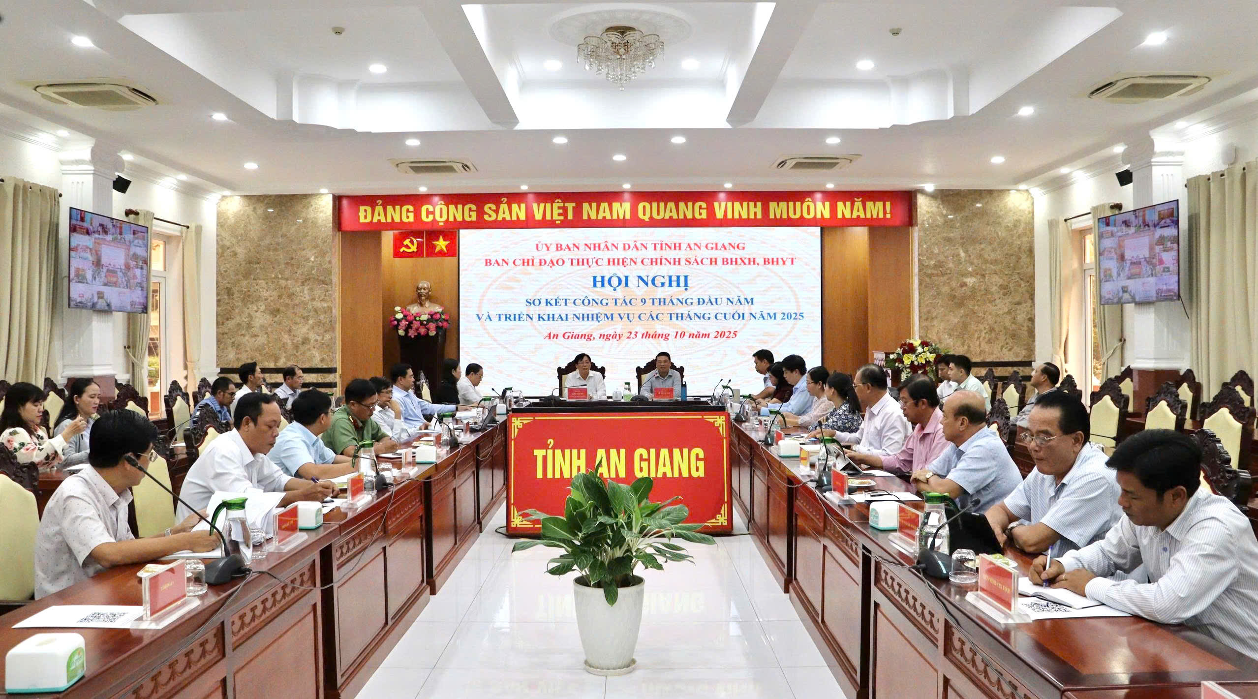 (Cổng TTĐT tỉnh AG) - Ngày 23/10, Tỉnh ủy viên, Phó Chủ tịch UBND tỉnh Lê Trung Hồ - Phó Trưởng ban Thường trực Ban Chỉ đạo Thực hiện Chính sách Bảo hiểm xã hội, Bảo hiểm y tế, chủ trì cuộc họp nghe báo cáo Sơ kết công tác 9 tháng đầu năm và triển khai nhiệm vụ các tháng cuối năm 2025 về thực hiện chính sách bảo hiểm xã hội (BHXH), bảo hiểm y tế (BHYT) trên địa bàn tỉnh An Giang.
