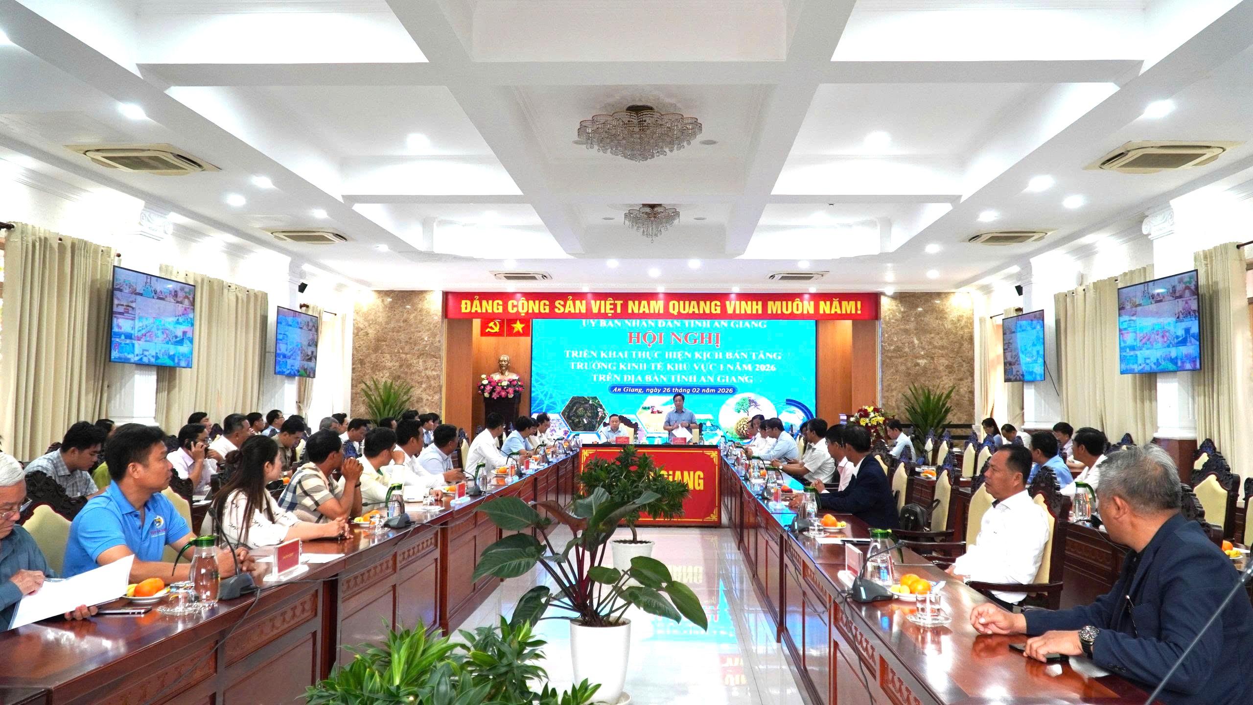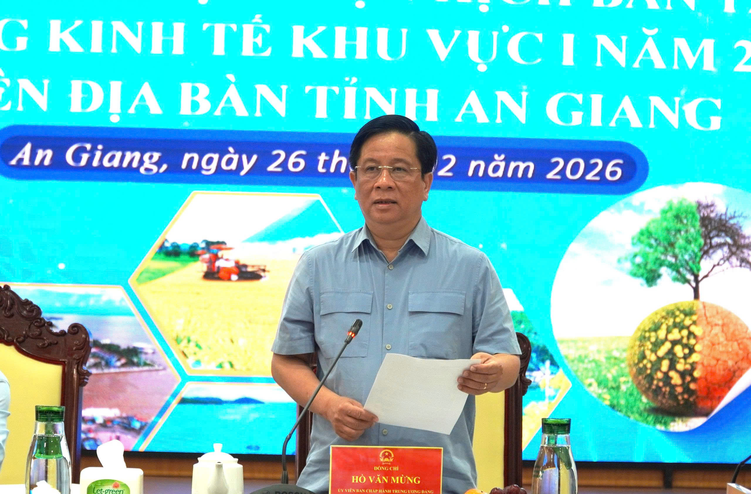 (Cổng TTĐT tỉnh AG) - Sáng 26/02, Ủy viên Ban Chấp hành Trung ương Đảng, Phó Bí thư Tỉnh ủy, Chủ tịch UBND tỉnh Hồ Văn Mừng chủ trì Hội nghị triển khai thực hiện kịch bản tăng trưởng kinh tế khu vực I năm 2026 trên địa bàn tỉnh.