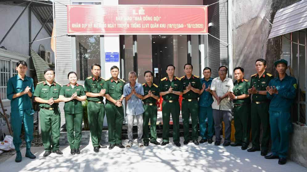 (Cổng TTĐT tỉnh AG)- Nằm trong chuỗi hoạt động chào mừng kỷ niệm 80 năm ngày Truyền thống lực lượng vũ trang Quân khu (10/12/1945 – 10/12/2025). Chiều 30/11, thừa ủy quyền của Bộ Tư lệnh Quân khu, Bộ Chỉ huy Quân sự (CHQS) tỉnh An Giang đã tổ chức lễ bàn giao nhà đồng đội cho gia đình quân nhân có hoàn cảnh khó khăn về nhà ở. Đại tá Cao Minh Tâm, Phó Chính ủy Bộ CHQS tỉnh tham dự lễ bàn giao.