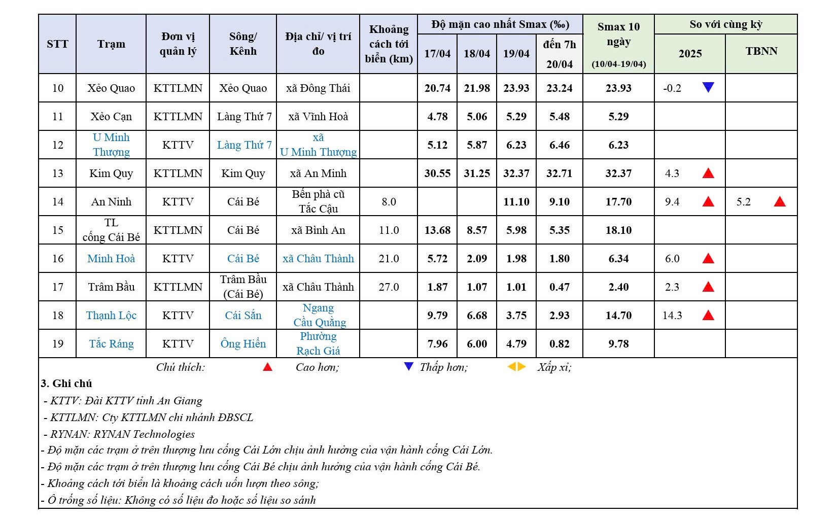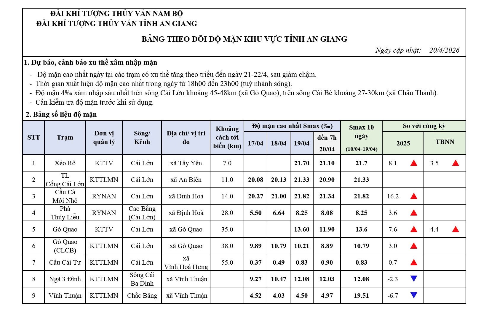aA Thời tiết - Thủy văn mực nước Bảng Theo dõi độ mặn khu vực tỉnh An Giang 20/04/2026, 09:56 Quay về Chia sẻ Copy link thành công Bài viết cùng chuyên mục Bản tin dự báo, cảnh báo khí tượng thuỷ văn thời hạn mùa tỉnh An Giang Thời tiết - Thủy văn mực nước 21/04/2026 Bản tin dự báo, cảnh báo thuỷ văn thời hạn ngắn tỉnh An Giang Thời tiết - Thủy văn mực nước 21/04/2026 Dự báo thời tiết điểm 10 ngày tới tại An Giang Thời tiết - Thủy văn mực nước Thông Báo 21/04/2026 Tin dự báo cảnh báo thuỷ văn thời hạn ngắn tỉnh An Giang Thời tiết - Thủy văn mực nước 21/04/2026 Tin dự báo nắng nóng tỉnh An Giang Thời tiết - Thủy văn mực nước 21/04/2026 Dự báo thời tiết điểm 10 ngày tới tại An Giang Thời tiết - Thủy văn mực nước 20/04/2026 Dự báo thời tiết đêm nay và ngày mai 21/4/2026 Thời tiết - Thủy văn mực nước 20/04/2026 Bản tin dự báo, cảnh báo thuỷ văn thời hạn ngắn tỉnh An Giang Thời tiết - Thủy văn mực nước 20/04/2026 Tin dự báo nắng nóng tỉnh An Giang Thời tiết - Thủy văn mực nước Thông Báo 20/04/2026 Bản tin dự báo, cảnh báo hải văn thời hạn đến 10 ngày vùng biển tỉnh An Giang Thời tiết - Thủy văn mực nước 17/04/2026 /vi/bang-theo-doi-do-man-khu-vuc-tinh-an-giang-1