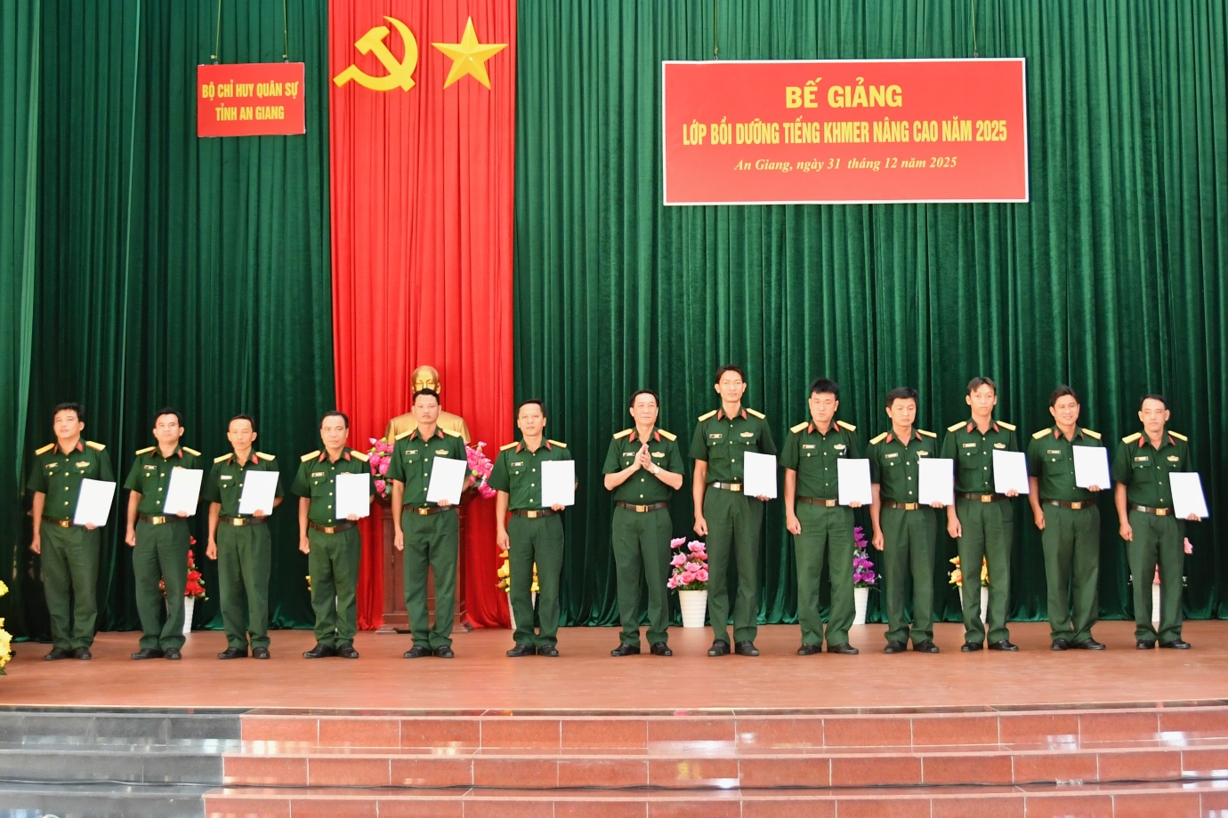 (Cổng TTĐT tỉnh AG)- Sáng ngày 31/12, tại Trung đoàn 893 (Bộ Chỉ huy Quân sự tỉnh An Giang), Trung tâm Ngoại ngữ - Tin học Victory (Trường Đại học Trà Vinh) phối hợp cùng Bộ Chỉ huy Quân sự (CHQS) tỉnh tổ chức bế mạc và báo cáo kết quả lớp bồi dưỡng tiếng Khmer nâng cao năm 2025. Đại tá Cao Minh Tâm, Phó Chính ủy Bộ CHQS tỉnh dự và chủ trì buổi bế giảng.