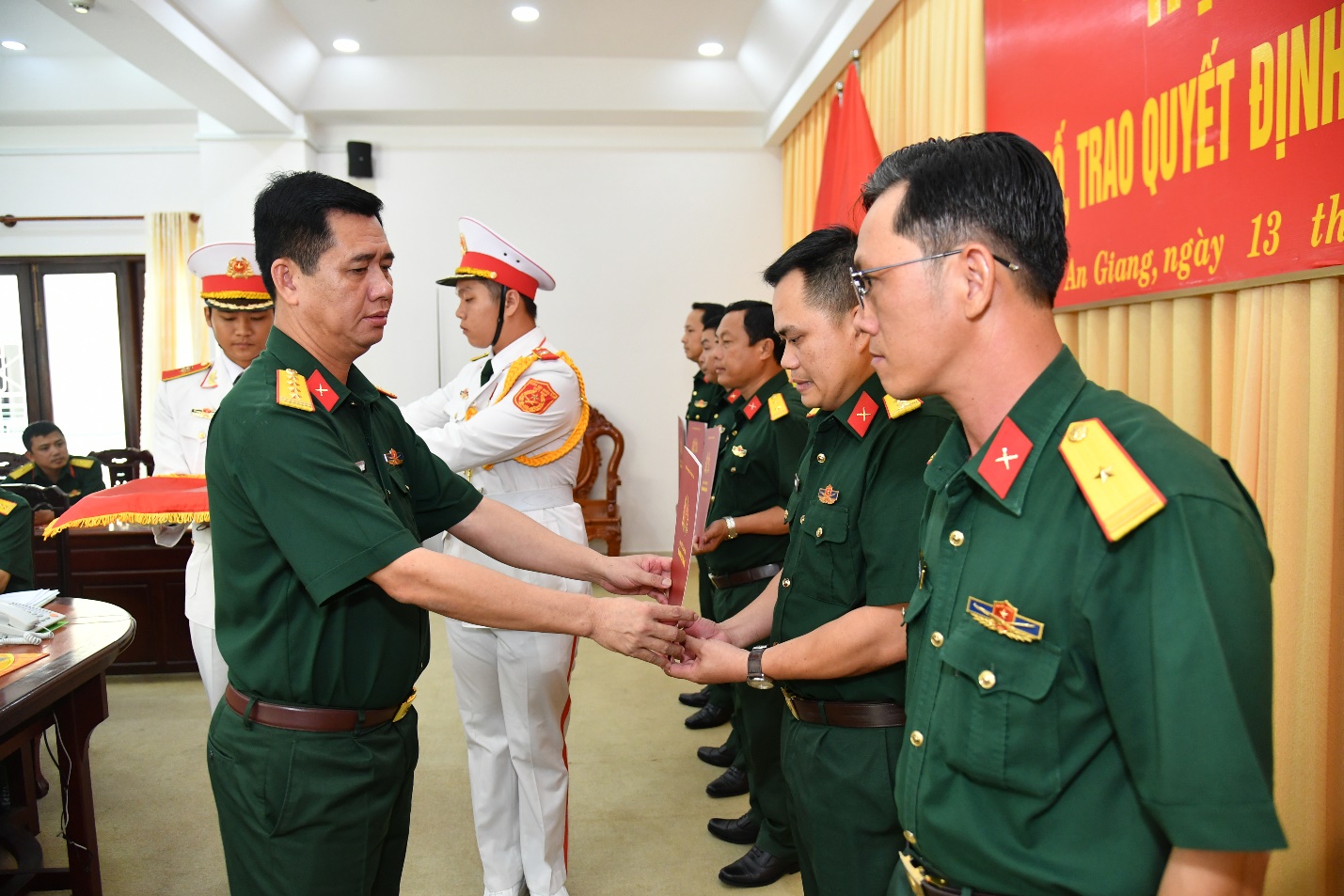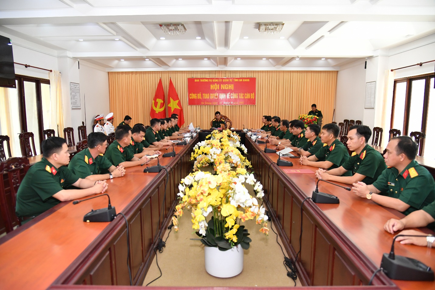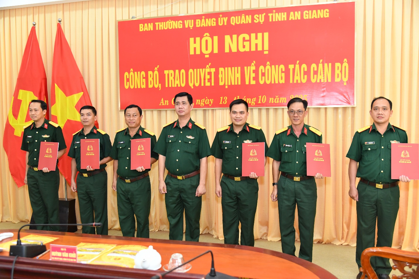Hội nghị đã công bố và trao quyết định cho 16 đồng chí thuộc Bộ CHQS tỉnh An Giang (trong đó: trao quyết định nghỉ việc hưởng chế độ bảo hiểm xã hội cho 3 đồng chí; trao quyết định nghỉ chờ hưu cho 1 đồng chí và trao quyết định điều động, bổ nhiệm chức vụ cán bộ cho 12 đồng chí).