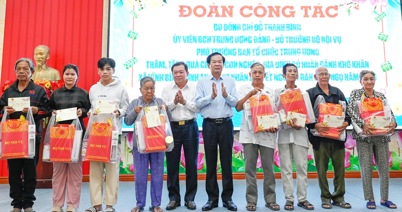 Dịp này, Bộ trưởng Bộ Nội vụ Đỗ Thanh Bình và đoàn công tác tặng 200 phần quà cho người nghèo, người có hoàn cảnh khó khăn trên địa bàn xã Vĩnh Bình.