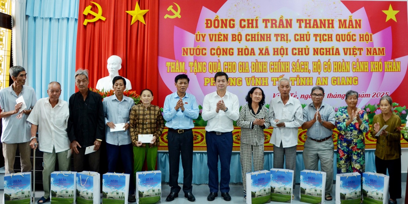 Dịp này, Chủ tịch Quốc hội Trần Thanh Mẫn trao 200 phần quà cho gia đình chính sách, người có công, trẻ em nghèo trên địa bàn xã Mỹ Hòa Hưng, hai phường Vĩnh Tế và Châu Đốc.