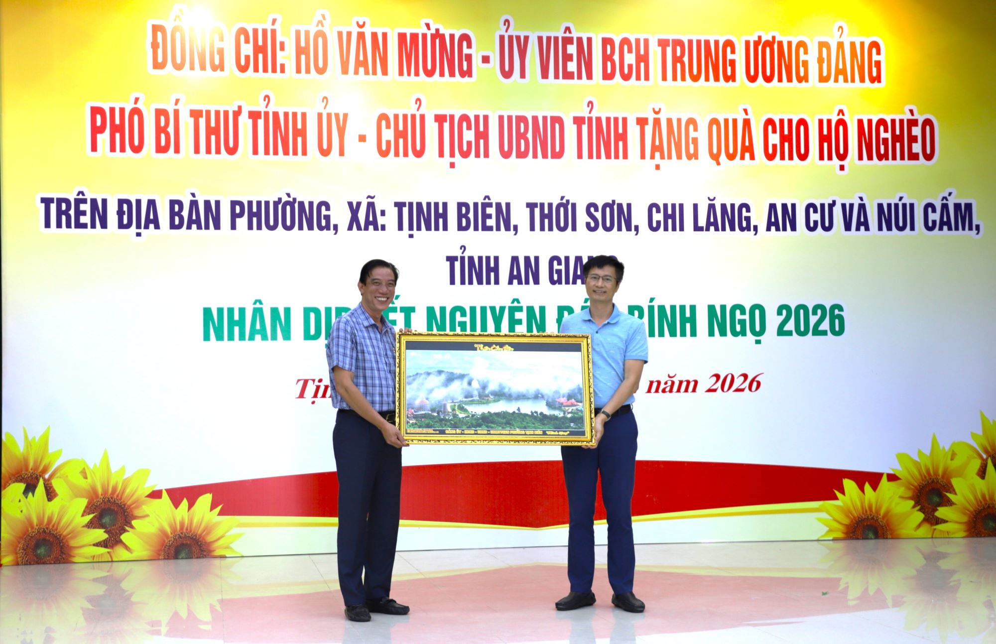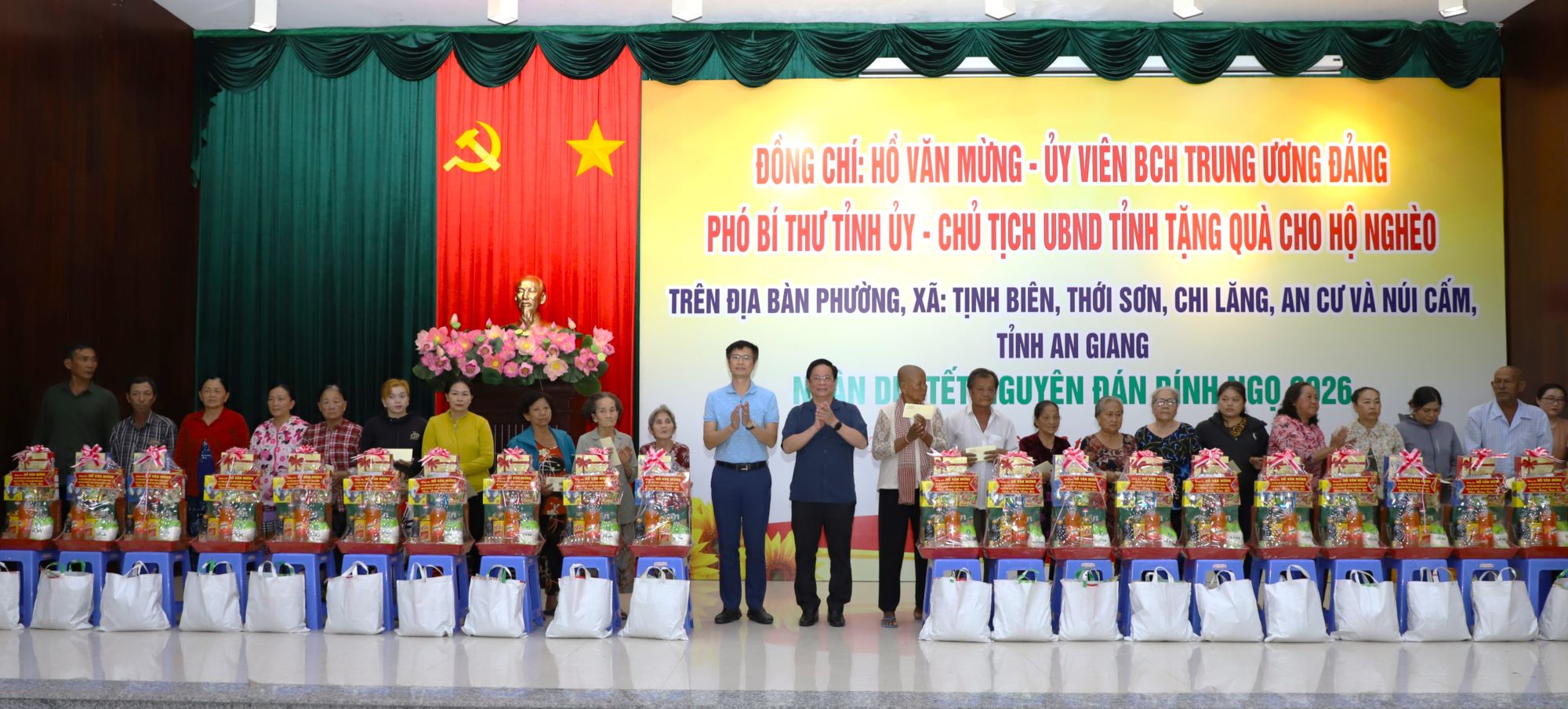 (Cổng TTĐT tỉnh AG) - Trong không khí phấn khởi của những ngày đầu Xuân Bính Ngọ - Năm 2026, với tinh thần “Tết đến với mọi nhà, không để ai bị bỏ lại phía sau”, chiều ngày 03/02, Đoàn công tác của UBND tỉnh An Giang, do Ủy viên BCH Trung ương Đảng, Phó Bí thư Tỉnh ủy, Chủ tịch UBND tỉnh Hồ Văn Mừng làm Trưởng đoàn đến thăm, chúc Tết và tặng 100 phần quà cho hộ nghèo trên địa bàn các phường, xã: Tịnh Biên, Thới Sơn, Chi Lăng, An Cư và Núi Cấm. Đại diện Lãnh đạo các sở, ban, ngành tỉnh; Tập đoàn Sun Group và Lãnh đạo địa phương cùng tham dự.