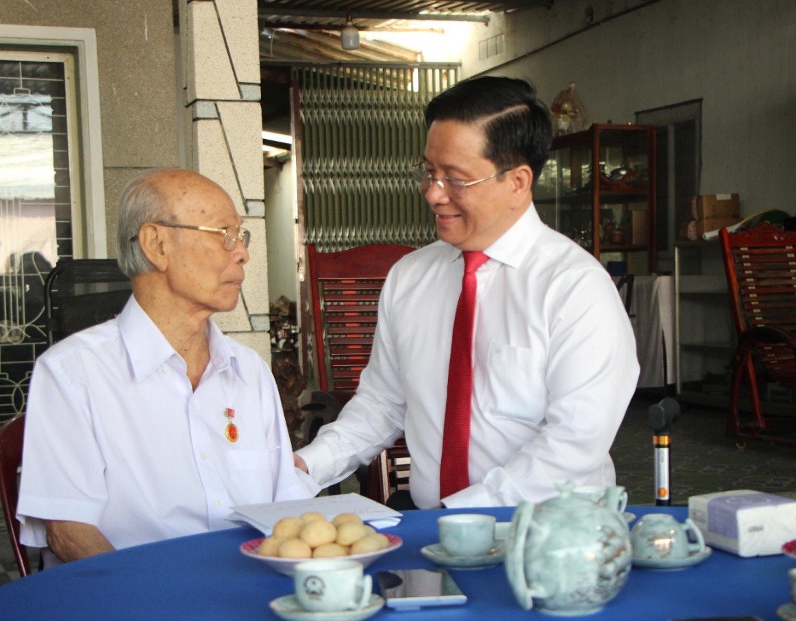 Đồng chí Hồ Văn Mừng ân cần thăm hỏi sức khỏe, đời sống gia đình, đồng thời trân trọng ghi nhận những đóng góp của đồng chí Nguyễn Thái Hòa trong sự nghiệp cách mạng vẻ vang của dân tộc, quá trình xây dựng và bảo vệ Tổ quốc.