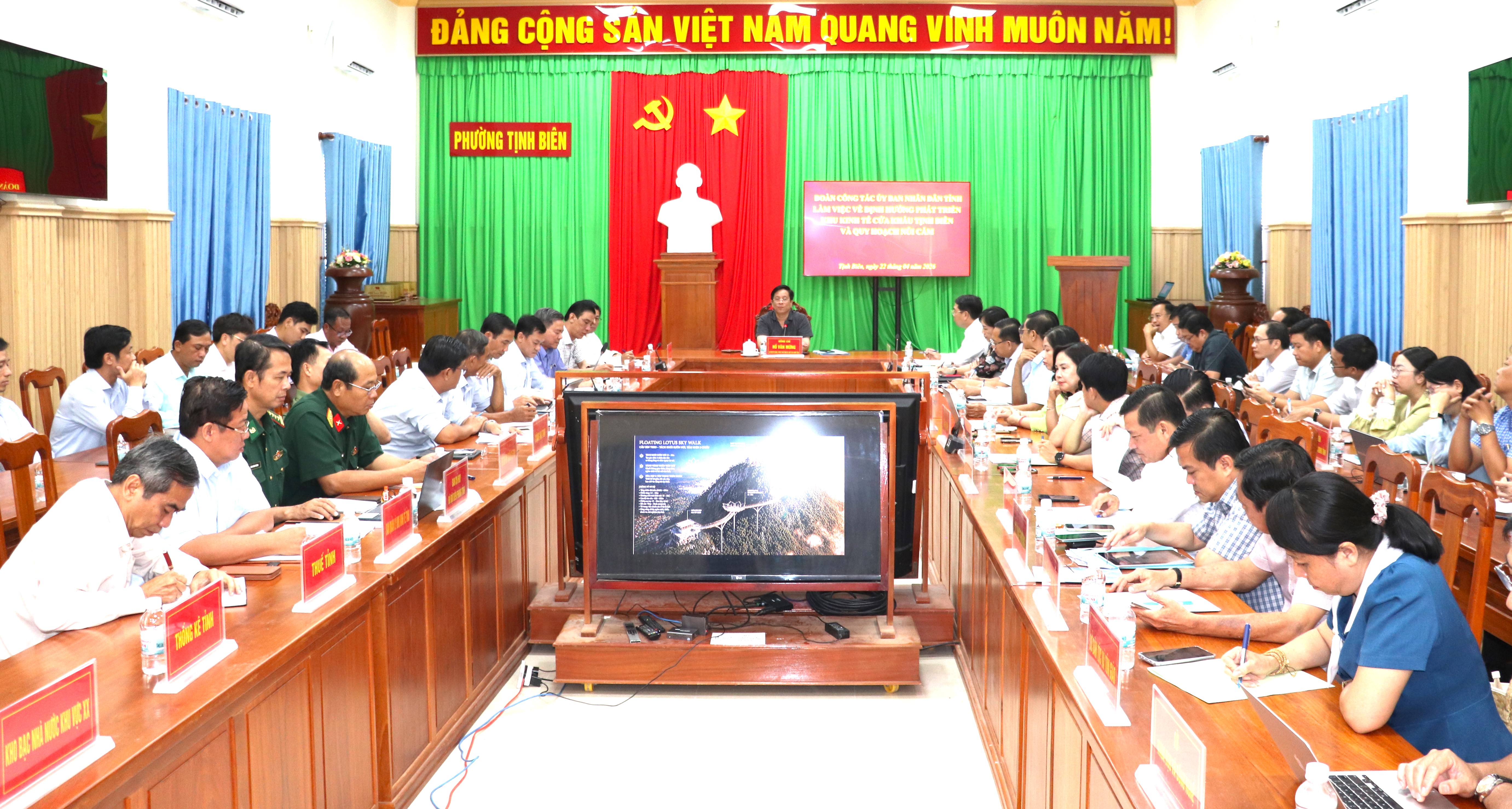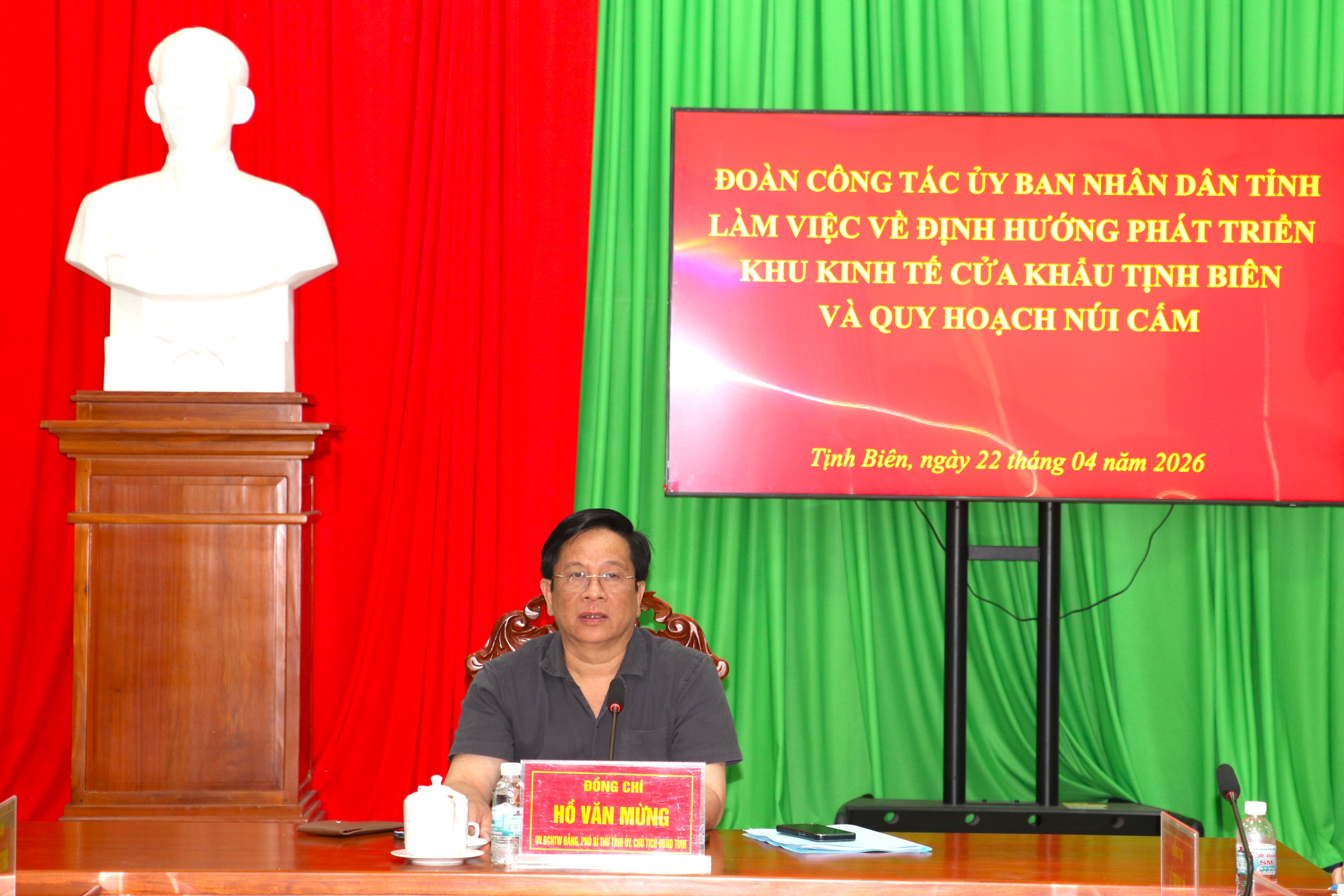 (Cổng TTĐT tỉnh AG) - Chiều 22/4, tại phường Tịnh Biên, Ủy viên Ban Chấp hành Trung ương Đảng, Phó Bí thư Tỉnh ủy, Chủ tịch UBND tỉnh Hồ Văn Mừng dẫn đầu đoàn công tác có buổi làm việc với UBND xã Núi Cấm về quy hoạch núi Cấm. Cùng dự có các Phó Chủ tịch UBND tỉnh: Ngô Công Thức, Lê Trung Hồ, Nguyễn Thị Minh Thúy.