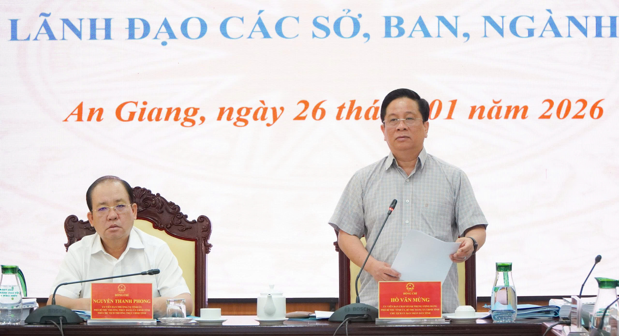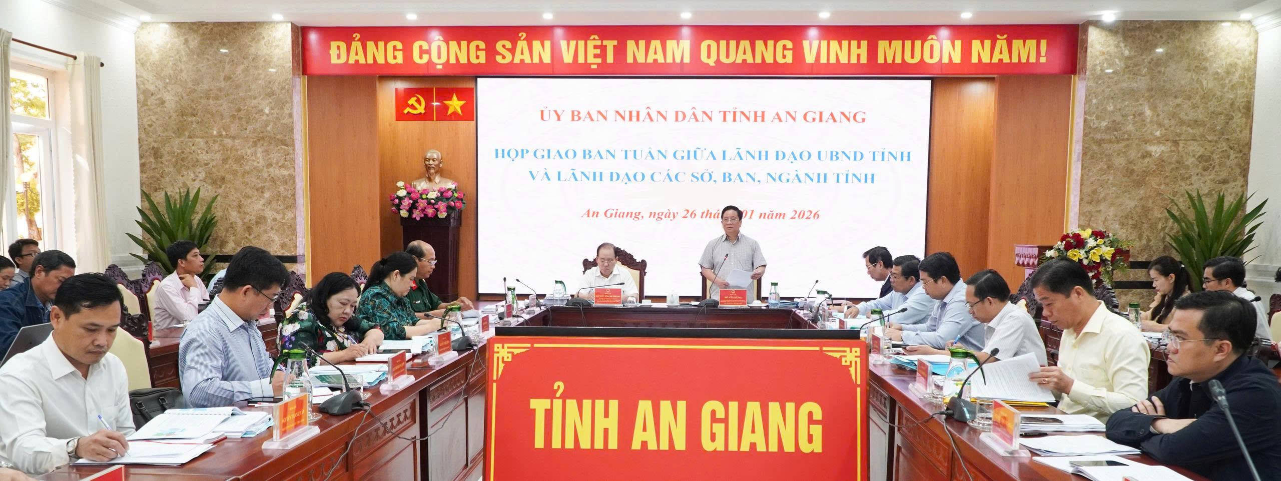 (Cổng TTĐT tỉnh AG) – Ngày 26/01, Ủy viên Ban Chấp hành Trung ương Đảng, Phó Bí thư Tỉnh ủy, Chủ tịch UBND tỉnh Hồ Văn Mừng chủ trì cuộc họp giao ban tuần giữa lãnh đạo UBND tỉnh và lãnh đạo các sở, ban, ngành. Cùng tham dự có Ủy viên Ban Thường vụ Tỉnh ủy, Phó Chủ tịch Thường trực UBND tỉnh Nguyễn Thanh Phong và các Phó Chủ tịch UBND tỉnh: Nguyễn Văn Phước, Ngô Công Thức, Lê Trung Hồ.