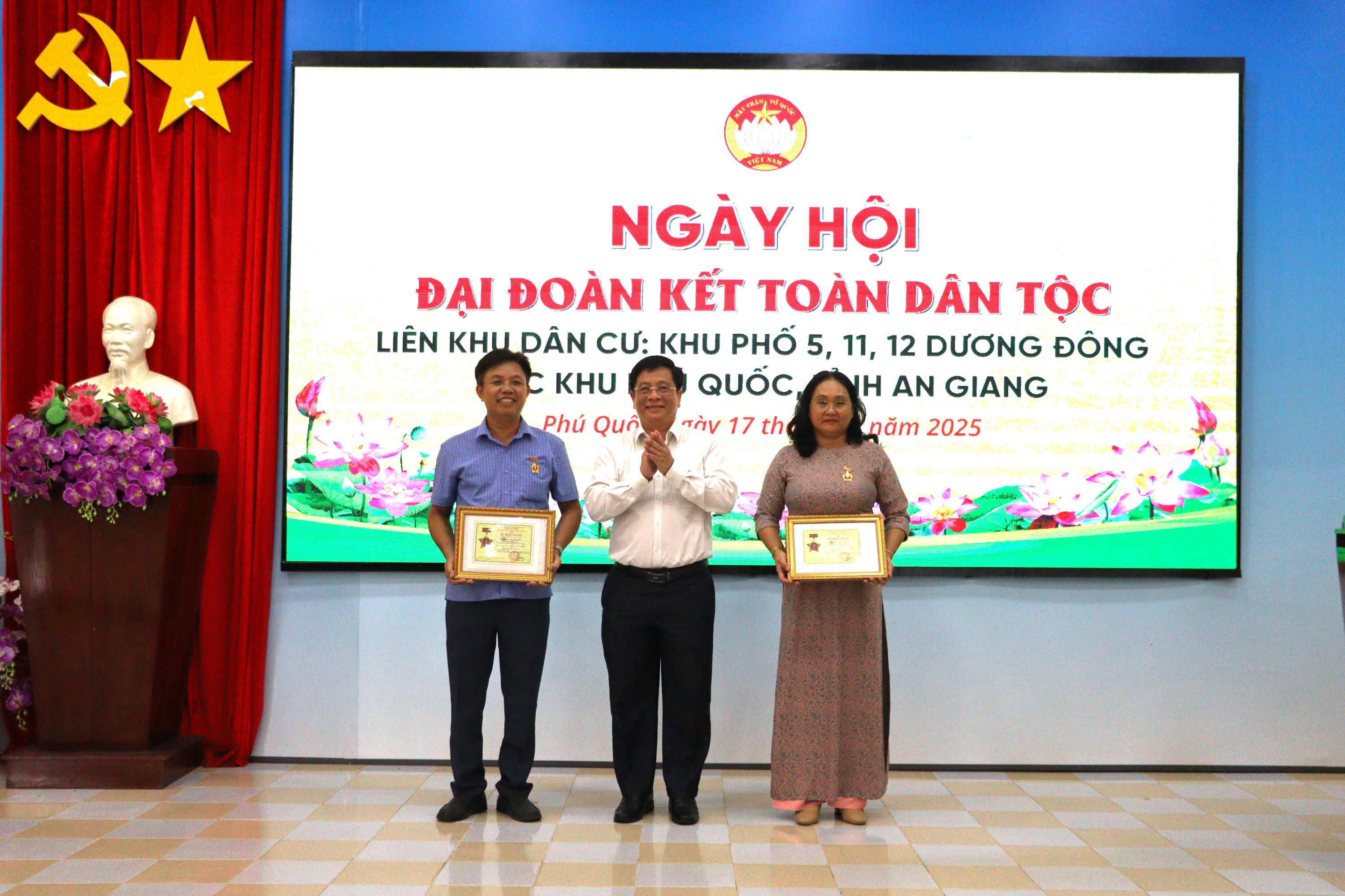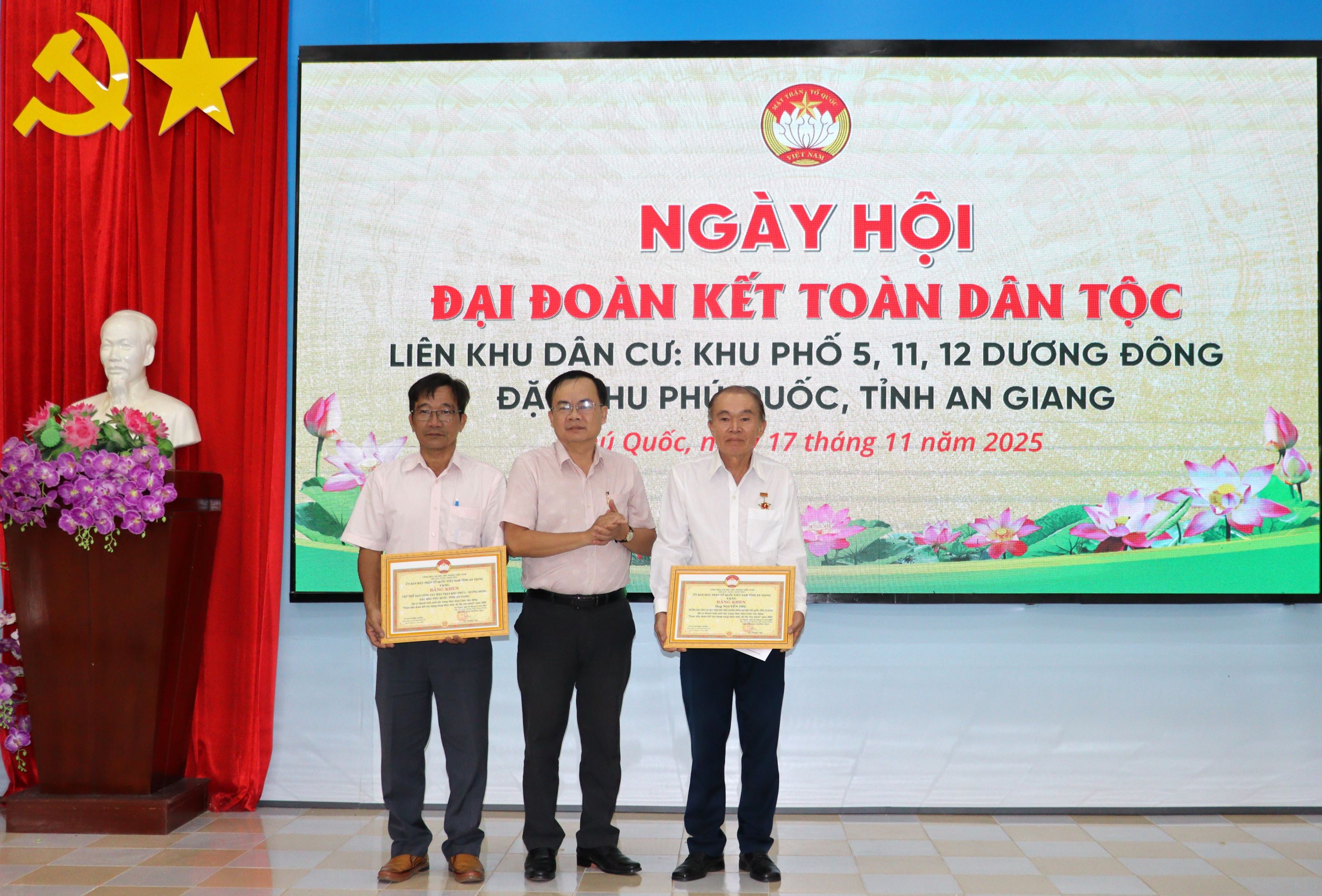 Dịp này, Ủy ban Trung ương Mặt trận Tổ quốc Việt Nam tặng kỷ niệm chương “Vì sự nghiệp đại đoàn kết” cho 2 cá nhân; Ủy ban Mặt trận Tổ quốc Việt Nam tỉnh An Giang tặng bằng khen cho 1 tập thể, 1 cá nhân đã có thành tích xuất sắc trong thực hiện Cuộc vận động “Toàn dân đoàn kết xây dựng nông thôn mới, đô thị văn minh” năm 2025; UBND đặc khu Phú Quốc tặng giấy khen cho 2 tập thể có thành tích xuất sắc trong thực hiện phong trào xây dựng nếp sống văn minh, gia đình văn hoá trong cuộc vận động “Toàn dân đoàn kết xây dựng nông thôn mới, đô thị văn minh” phường Dương Đông năm 2025.