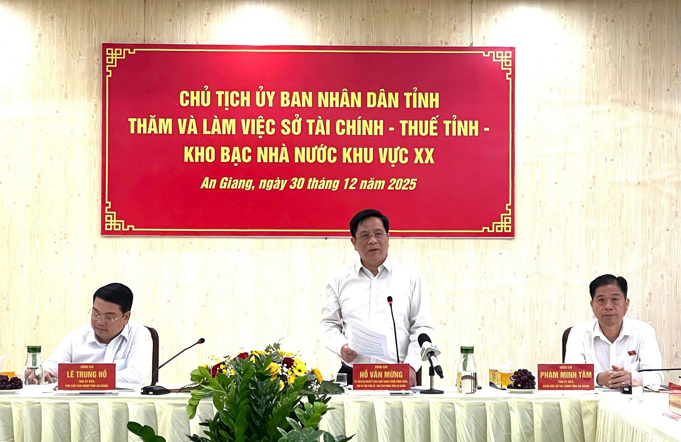 (Cổng TTĐT tỉnh AG)- Chiều 30/12, Ủy viên dự khuyết BCH Trung ương Đảng, Phó Bí thư Tỉnh uỷ, Chủ tịch UBND tỉnh Hồ Văn Mừng đến thăm và làm việc với Sở Tài chính, Cục Thuế tỉnh và Kho bạc Nhà nước khu vực XX, nhằm đánh giá tình hình thực hiện nhiệm vụ tài chính, ngân sách, thu chi ngân sách nhà nước; công tác khoá sổ và thực hiện quy chế phối hợp. Cùng tham dự, có Phó Chủ tịch UBND tỉnh Lê Trung Hồ.