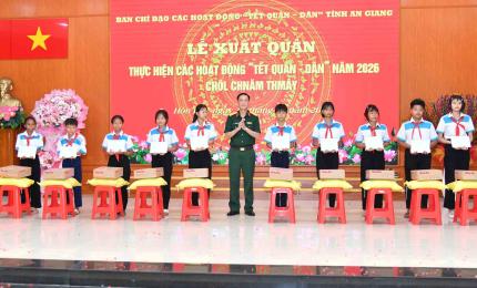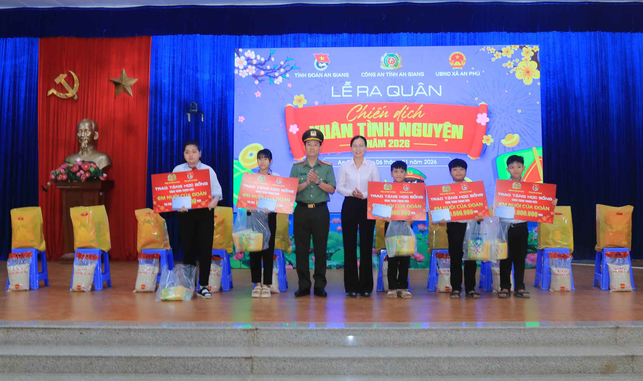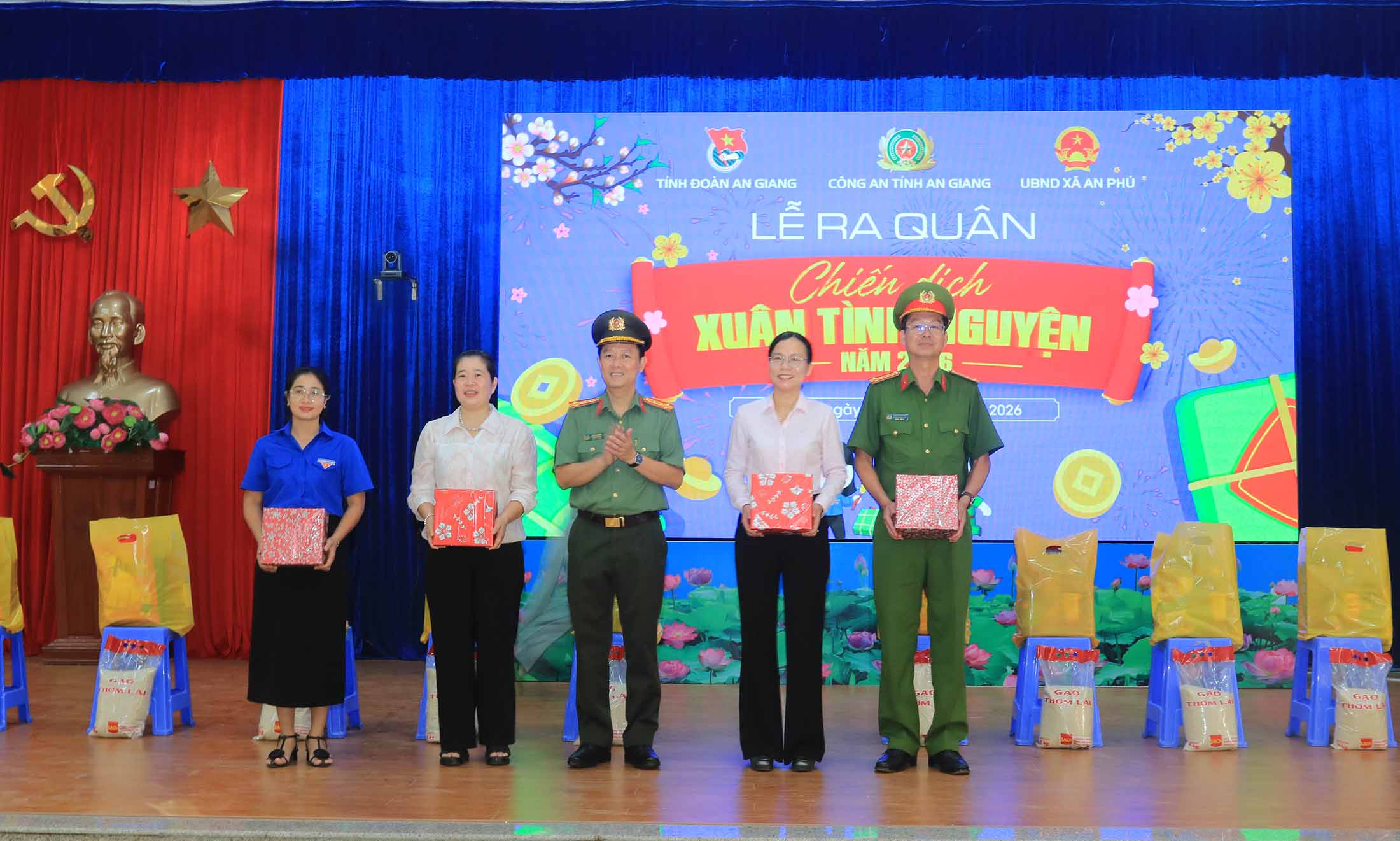 (Cổng TTĐT tỉnh AG)-Sáng 06/01, Ban Thanh niên Công an tỉnh phối hợp Ủy ban nhân dân xã, Đoàn Thanh niên xã An Phú tổ chức Lễ ra quân chiến dịch “Xuân Tình nguyện” năm 2026. Đồng chí Đại tá Lê Phú Thạnh - Tỉnh uỷ viên, Phó Bí thư Đảng uỷ, Phó Giám đốc Công an tỉnh; Đồng chí Quách Tố Giang - Tỉnh uỷ viên, Bí thư Đảng uỷ, Chủ tịch HĐND xã An Phú; Phó Bí thư Tỉnh Đoàn Thị Phương Hồng cùng tham dự.