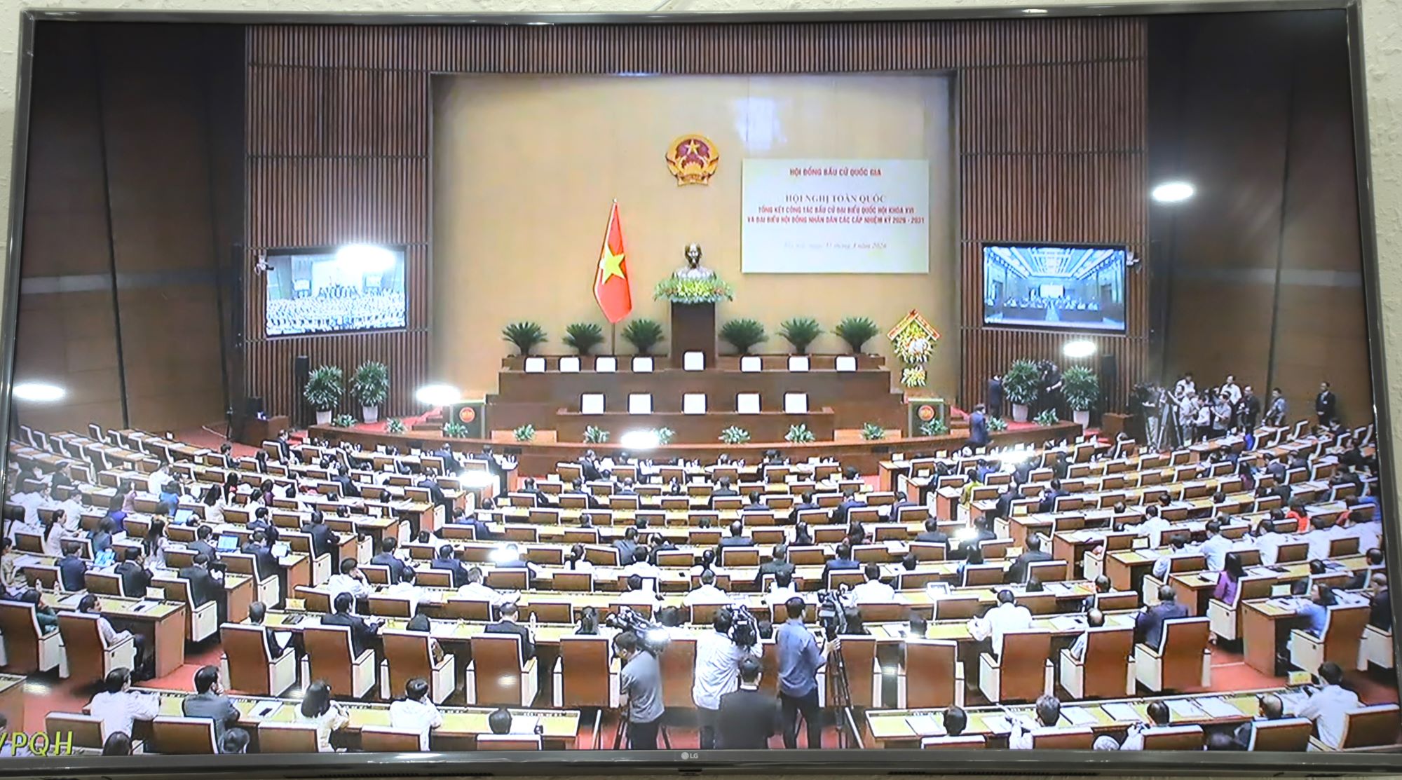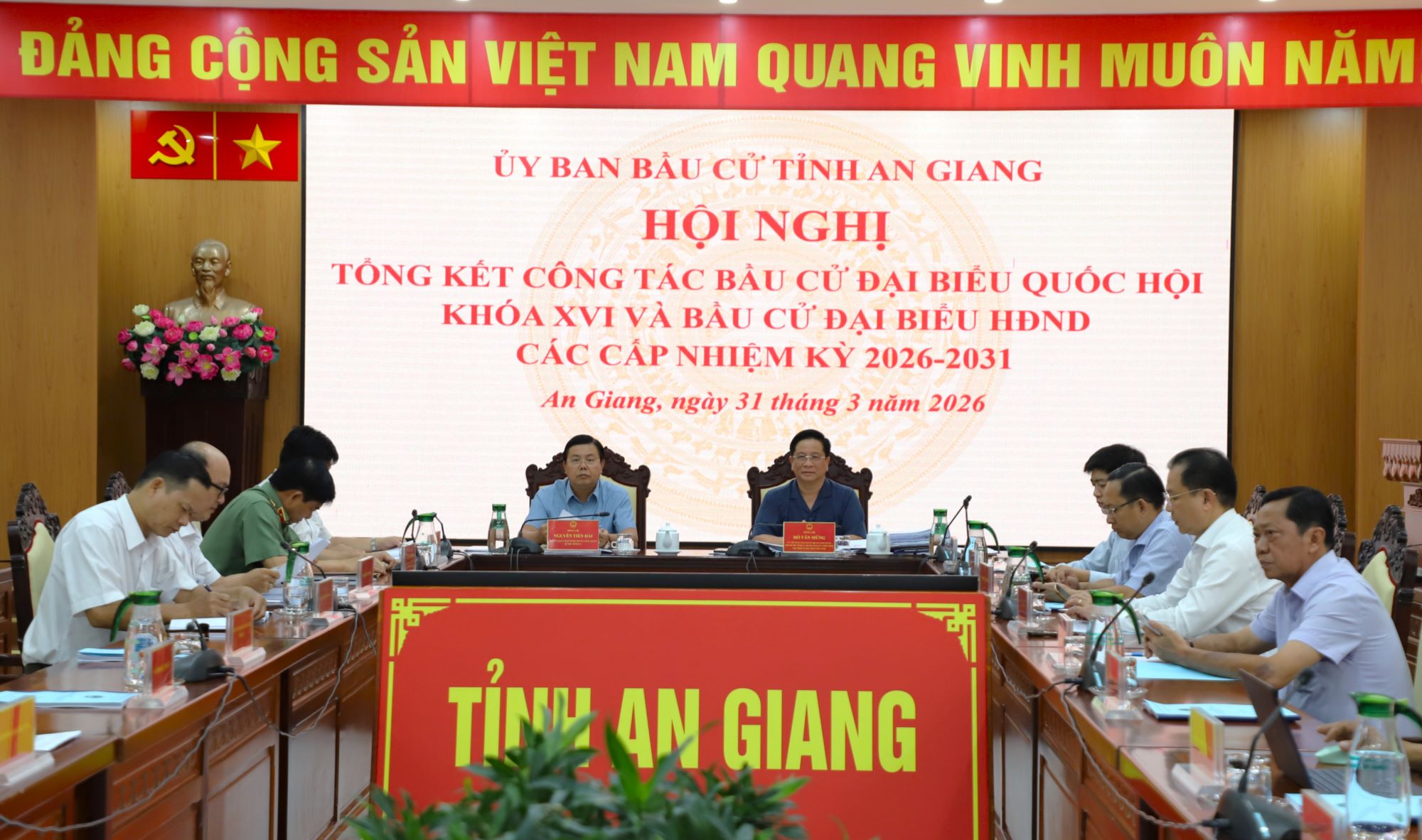 (Cổng TTĐT tỉnh AG) - Chiều ngày 31/3, Hội đồng bầu cử quốc gia đã tổ chức Hội nghị toàn quốc tổng kết công tác bầu cử đại biểu Quốc hội khóa XVI và bầu cử đại biểu HĐND các cấp nhiệm kỳ 2026 - 2031. Tại điểm cầu Trung ương, có Tổng Bí thư Tô Lâm; Chủ tịch nước Lương Cường; Thủ tướng Chính phủ Phạm Minh Chính; Ủy viên Bộ Chính trị, Chủ tịch Quốc hội, Chủ tịch Hội đồng bầu cử Quốc gia Trần Thanh Mẫn; các Ủy viên Bộ Chính trị; Ủy viên Hội đồng bầu cử quốc gia; Lãnh đạo một số bộ, ngành và các tỉnh, thành phố cùng tham dự.