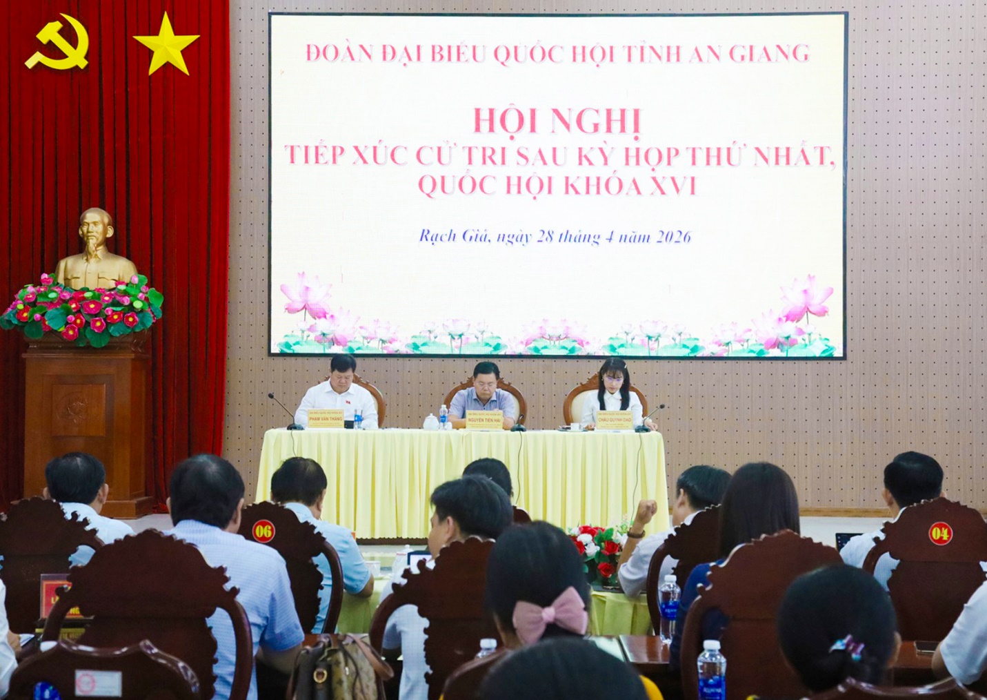 (Cổng TTĐT tỉnh AG)- Chiều 28/4, Đoàn Đại biểu Quốc hội (ĐBQH) tỉnh An Giang (đơn vị số 1) gồm các đại biểu: Nguyễn Tiến Hải - Ủy viên Ban Chấp hành Trung ương Đảng, Bí thư Tỉnh ủy, Trưởng Đoàn ĐBQH tỉnh An Giang; Phạm Văn Thắng - Phó Chỉ huy trưởng Bộ Chỉ huy Quân sự tỉnh kiêm Chỉ huy trưởng Ban Chỉ huy Bộ đội Biên phòng tỉnh An Giang; Châu Quỳnh Dao - Hiệu trưởng Trường Trung học phổ thông Ngô Sĩ Liên tiếp xúc hơn 100 cử tri phường Rạch Giá (An Giang).