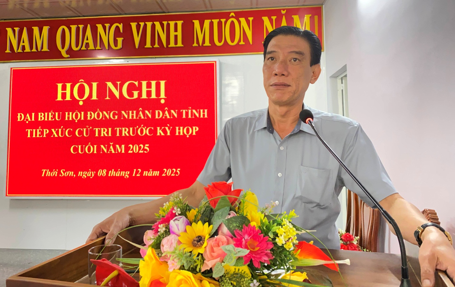 (Cổng TTĐT tỉnh AG)- Chiều ngày 08/12, tại phường Thới Sơn, Đại biểu HĐND tỉnh An Giang do Tỉnh ủy viên, đại biểu HĐND tỉnh (Tổ đại biểu số 06) Nguyễn Hồng Đức chủ trì, đã có buổi tiếp xúc cử tri (TXCT) trước kỳ họp cuối năm 2025.