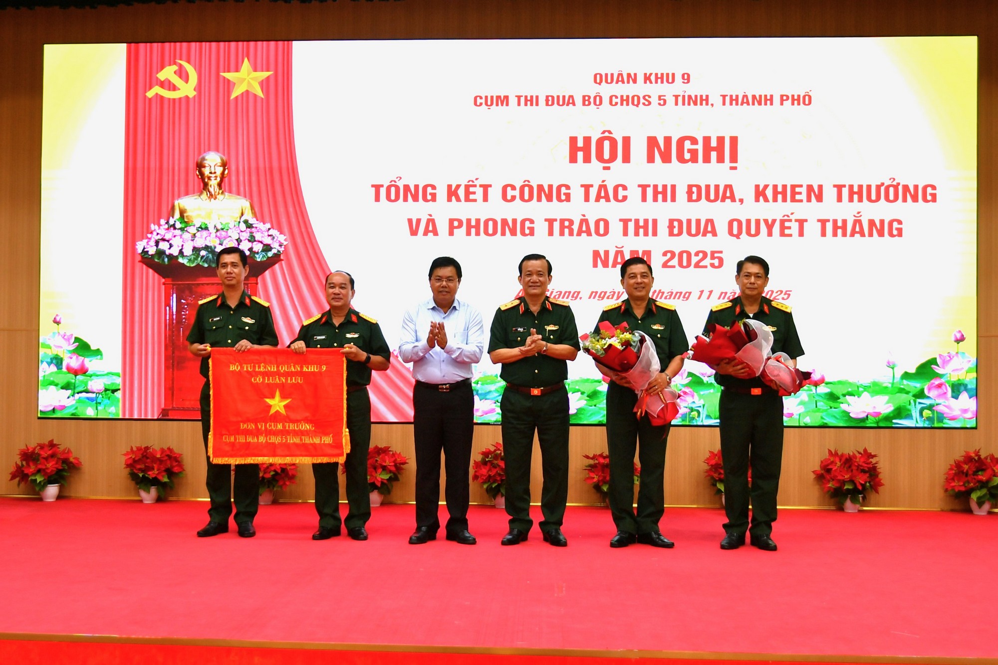 Tại hội nghị Hội đồng thi đua, khen thưởng Lực lượng vũ trang Quân khu 9 đã trao cờ, bàn giao cờ cho đơn vị cụm trưởng Cụm thi đua Bộ CHQS 5 tỉnh, thành (Quân khu 9) năm 2026 cho Bộ CHQS tỉnh An Giang./.