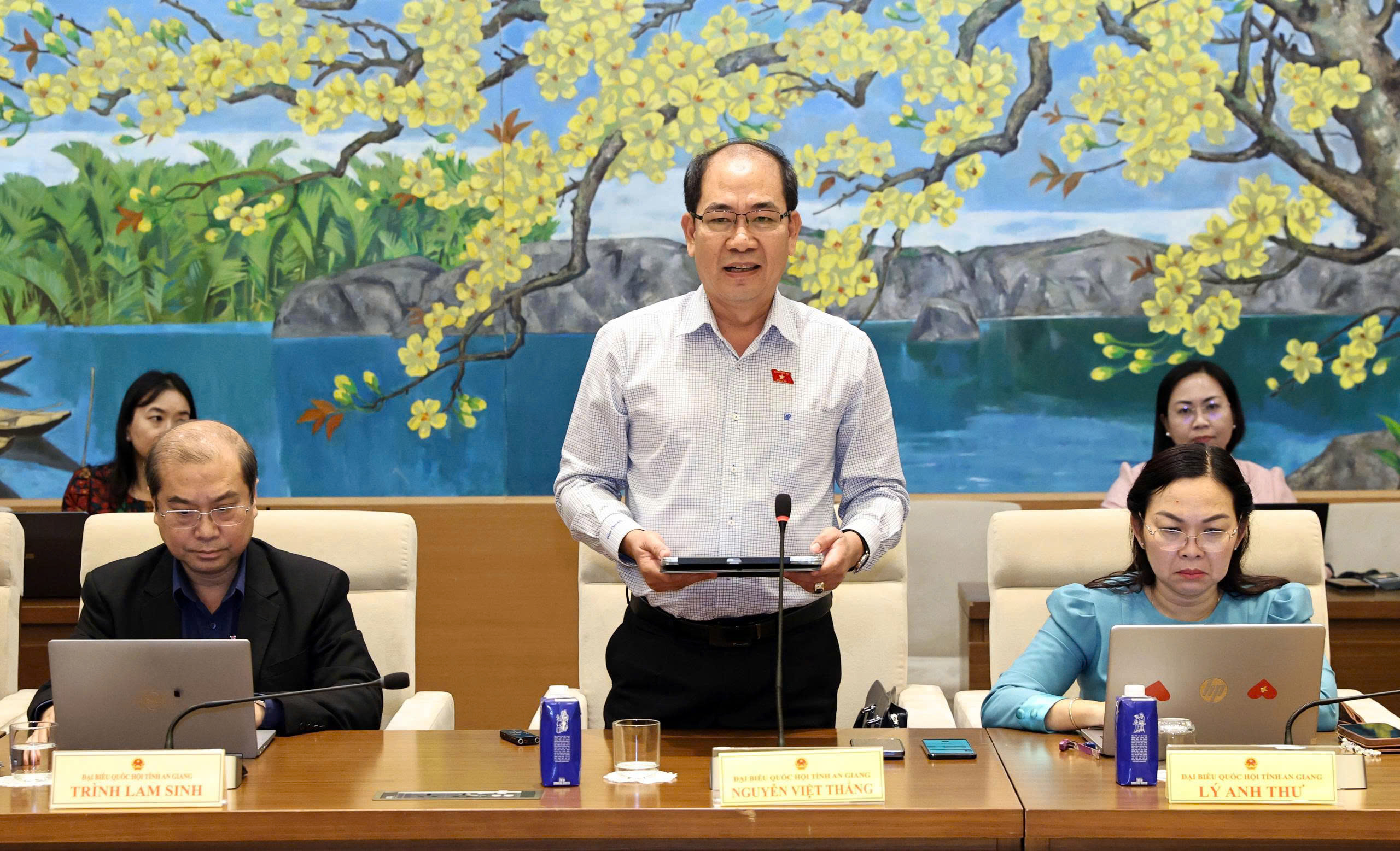 Đại biểu Nguyễn Việt Thắng – Phó Chủ nhiệm Thường trực Ủy ban Kiểm tra Tỉnh ủy An Giang thống nhất với báo cáo thẩm tra của Ủy ban Kinh tế và Tài chính của Quốc hội. Dự thảo Luật tập trung sửa đổi 3 nội dung chính, nhằm giải quyết triệt để các bất cập thực tiễn. Tuy nhiên, các nội dung này chưa đủ cơ sở để điều chỉnh trong Kỳ họp 10, đề nghị cân nhắc thận trọng vì luật và các văn bản hướng dẫn vừa triển khai, chưa đủ thời gian đánh giá toàn diện.