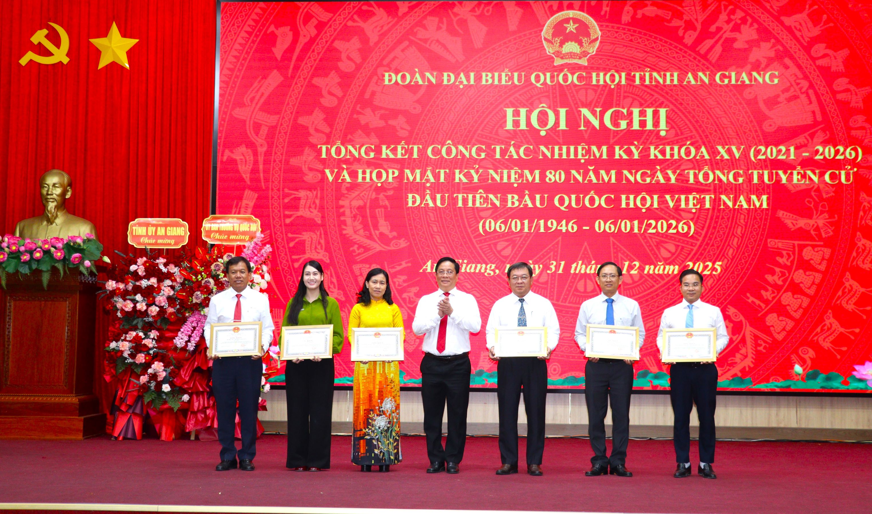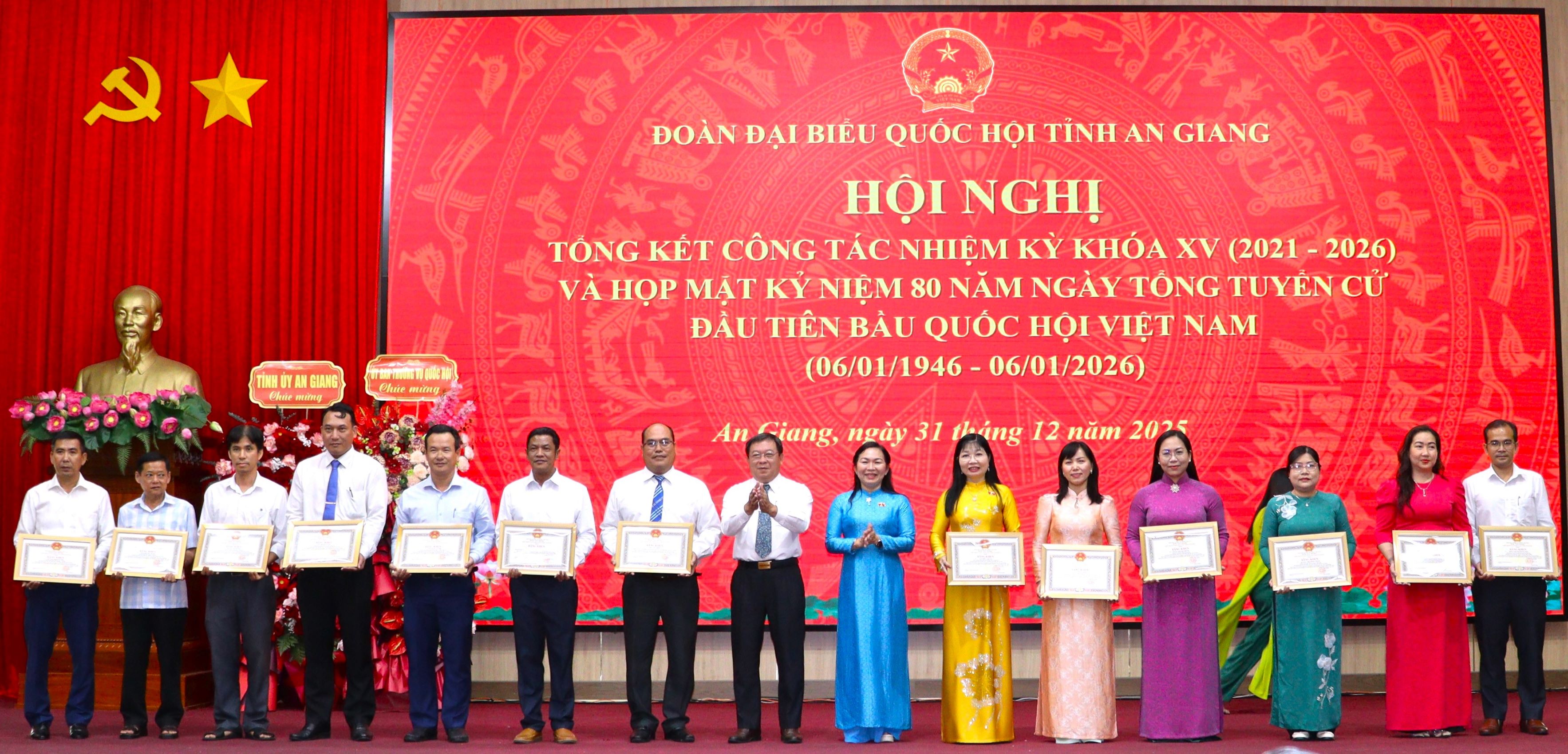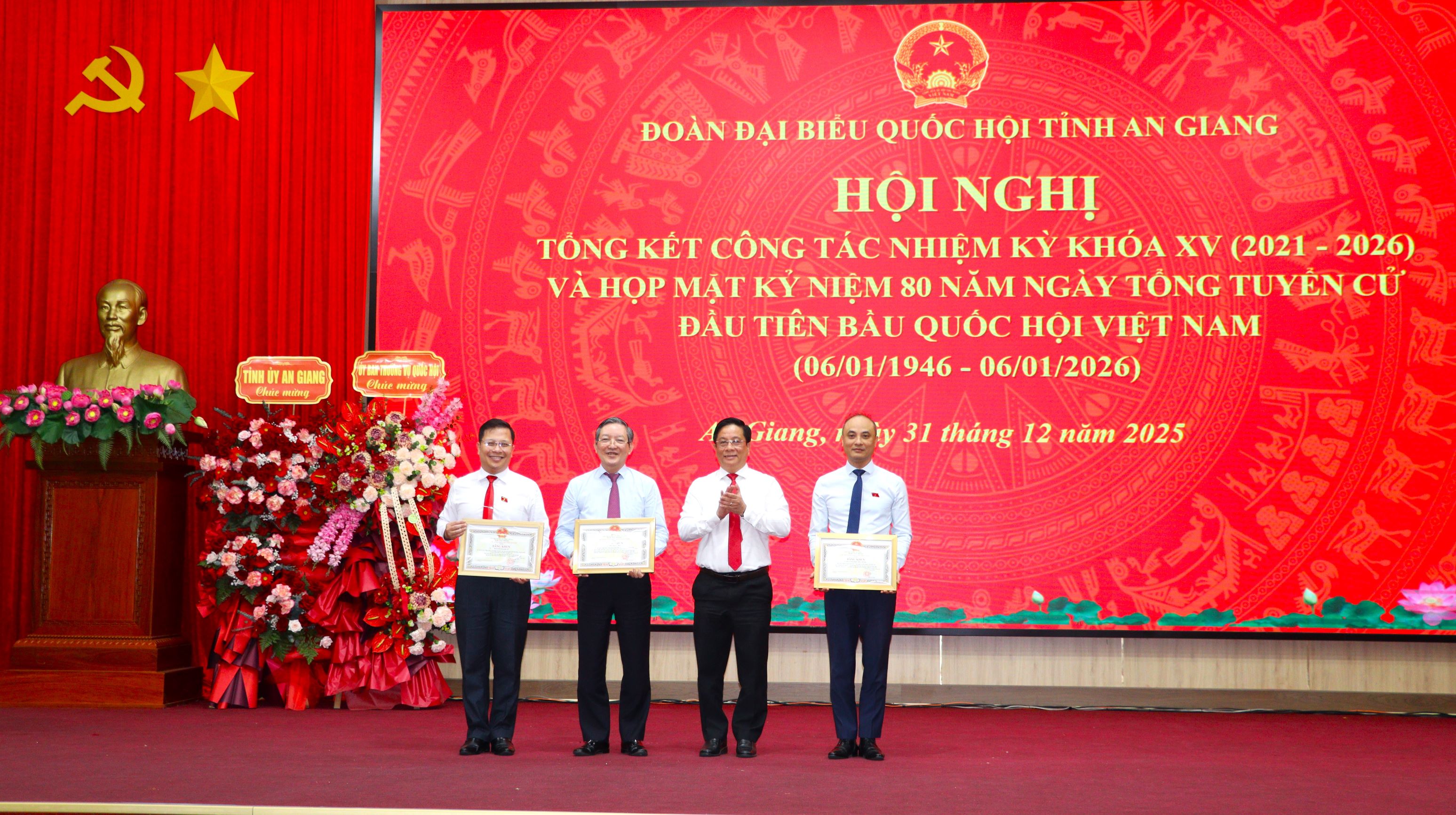 Chủ tịch UBND tỉnh An Giang tặng Bằng khen cho 06 cá nhân có thành tích xuất sắc trong vận động đóng góp vật chất và kinh phí thực hiện hiệu quả công tác an sinh xã hội trên địa bàn tỉnh An Giang nhiệm kỳ 2021-2026; 09 tập thể, 29 cá nhân có thành tích xuất sắc trong thực hiện nhiệm vụ đại biểu Quốc hội, công tác phối hợp, tham mưu và phục vụ các hoạt động của Đoàn Đại biểu Quốc hội tỉnh An Giang, nhiệm kỳ 2021-2026./.