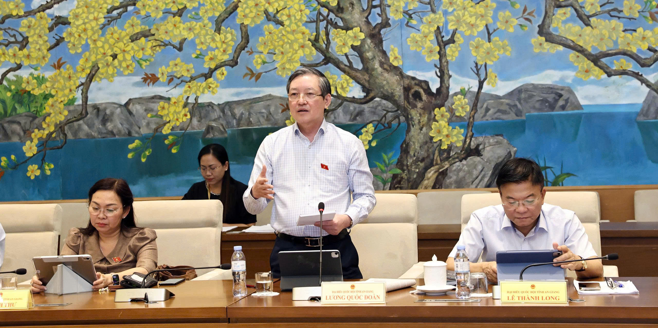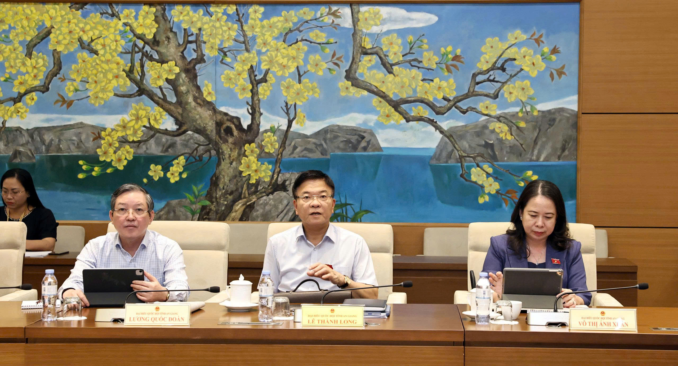 (Cổng TTĐT tỉnh AG)- Chiều 22/10, tiếp tục chương trình Kỳ họp thứ 10 Quốc hội khóa XV, Tổ số 14 (gồm Đoàn đại biểu Quốc hội tỉnh Quảng Ninh, An Giang, Hà Tĩnh) thảo luận về dự án Luật sửa đổi, bổ sung một số điều của Luật Giáo dục, Luật Giáo dục đại học (sửa đổi), Luật Giáo dục nghề nghiệp (sửa đổi). Phó Bí thư Tỉnh ủy, Trưởng đoàn Đại biểu Quốc hội tỉnh, Chủ tịch Ủy ban Mặt trận Tổ quốc Việt Nam tỉnh An Giang Trần Thị Thanh Hương chủ trì phiên thảo luận.
