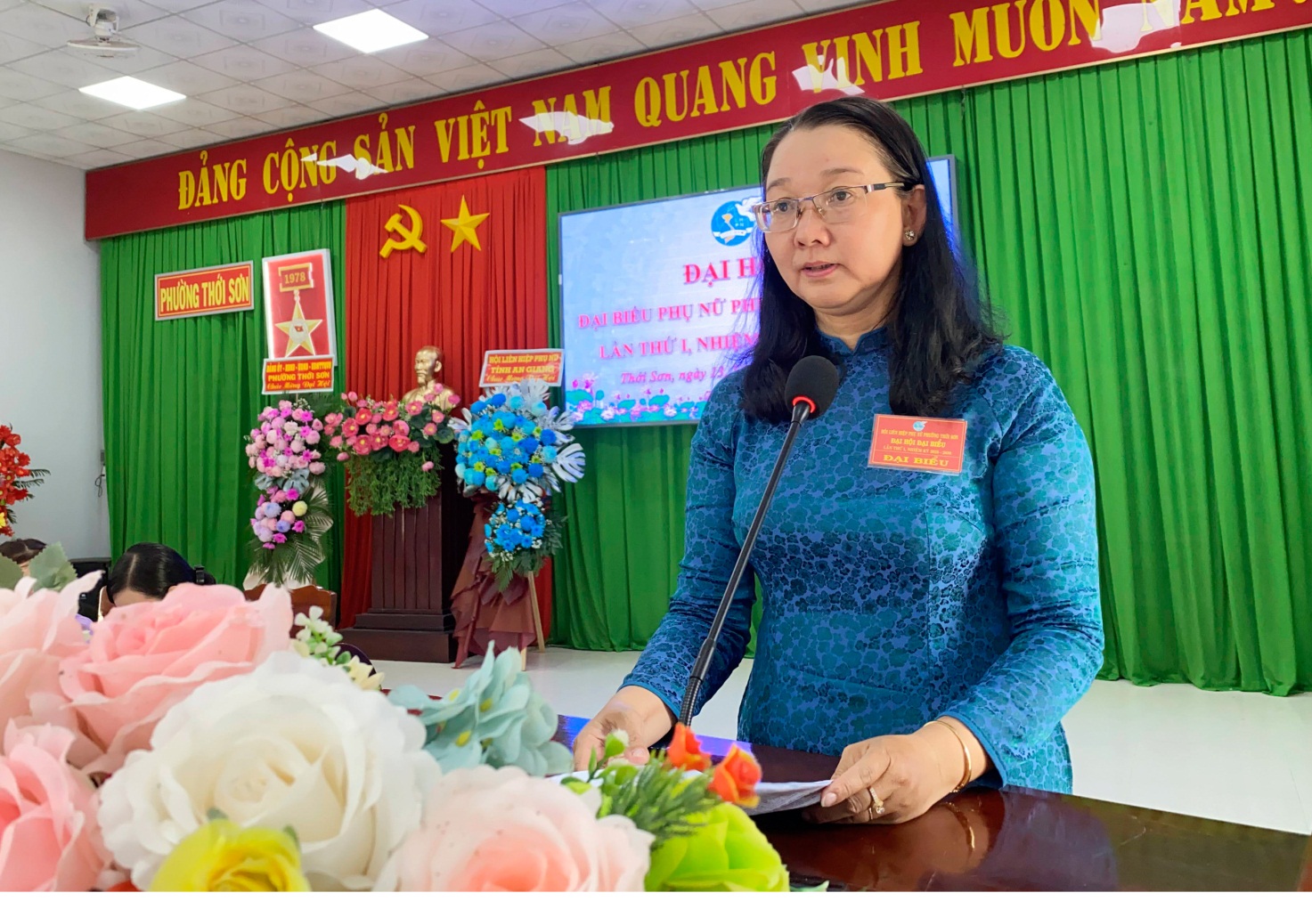 Phát biểu tại Đại hội, Phó Chủ tịch Ủy ban MTTQ Việt Nam tỉnh An Giang, Chủ tịch Hội LHPN tỉnh Trương Thanh Thúy đã ghi nhận và biểu dương những kết quả mà phong trào phụ nữ phường đã đạt được trong nhiệm kỳ qua. Đồng thời nhấn mạnh, trong bối cảnh đất nước đang đứng trước nhiều thời cơ và thách thức mới từ quá trình hội nhập quốc tế, chuyển đổi số và phát triển kinh tế xanh, tổ chức Hội cần phải có những bước đi đột phá, cần tập trung thực hiện trong nhiệm kỳ 2025-2030: Xây dựng tổ chức Hội vững mạnh, phát huy tốt vai trò cầu nối giữa cấp ủy, chính quyền và hội viên, xứng đáng là chỗ dựa tin cậy của phụ nữ; Phát động mạnh mẽ các phong trào thi đua, triển khai sâu rộng phong trào “Xây dựng người Phụ nữ Việt Nam thời đại mới” và cuộc vận động “Xây dựng gia đình 5 có, 3 sạch”, khơi dậy tinh thần tự học, tự rèn luyện để trở thành người phụ nữ có tri thức, đạo đức, sức khỏe và trách nhiệm; Đa dạng hóa hình thức tập hợp hội viên, mở rộng các mô hình hoạt động để thu hút đông đảo các tầng lớp phụ nữ, đặc biệt là nữ trí thức, thanh niên, doanh nhân và phụ nữ đi làm ăn xa; Đẩy mạnh chuyển đổi số, trang bị kỹ năng số cơ bản cho cán bộ, hội viên và ứng dụng công nghệ thông tin trong điều hành, tuyên truyền, khuyến khích phụ nữ kinh doanh trên các nền tảng số; Phát huy vai trò phụ nữ trong phát triển kinh tế, chủ động kết nối các nguồn lực để hỗ trợ vốn, đào tạo nghề, hướng dẫn khởi nghiệp và nhân rộng các mô hình sinh kế xanh, sạch, tuần hoàn; Xây dựng đội ngũ cán bộ Hội cơ sở chuyên nghiệp, chú trọng phát hiện, bồi dưỡng và giới thiệu cán bộ nữ trẻ, có năng lực để tạo nguồn phát triển lâu dài.