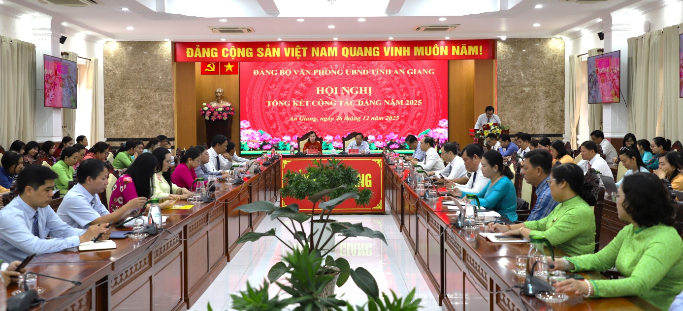 Phát biểu chỉ đạo tại Hội nghị, Bí thư Đảng ủy, Chánh Văn phòng UBND tỉnh An Giang Lê Kỳ Quang yêu cầu các Chi bộ tiếp tục tập trung xây dựng Đảng bộ trong sạch, vững mạnh; nâng cao năng lực lãnh đạo, sức chiến đấu của tổ chức đảng và chất lượng đội ngũ cán bộ, đảng viên. Trọng tâm là lãnh đạo thực hiện thắng lợi các mục tiêu phát triển kinh tế - xã hội theo Nghị quyết Tỉnh ủy, HĐND tỉnh; đẩy mạnh cải cách hành chính, chuyển đổi số, nâng cao hiệu lực, hiệu quả quản lý nhà nước. Đảng bộ phấn đấu đạt trong sạch vững mạnh, kết nạp đảng viên mới; tăng cường công tác kiểm tra, giám sát, phòng chống tham nhũng; thực hiện tốt quy chế dân chủ ở cơ sở, chăm lo đời sống cán bộ, công chức, viên chức, tạo nền tảng vững chắc cho sự phát triển ổn định, bền vững của tỉnh trong năm 2026 và những năm tiếp theo.