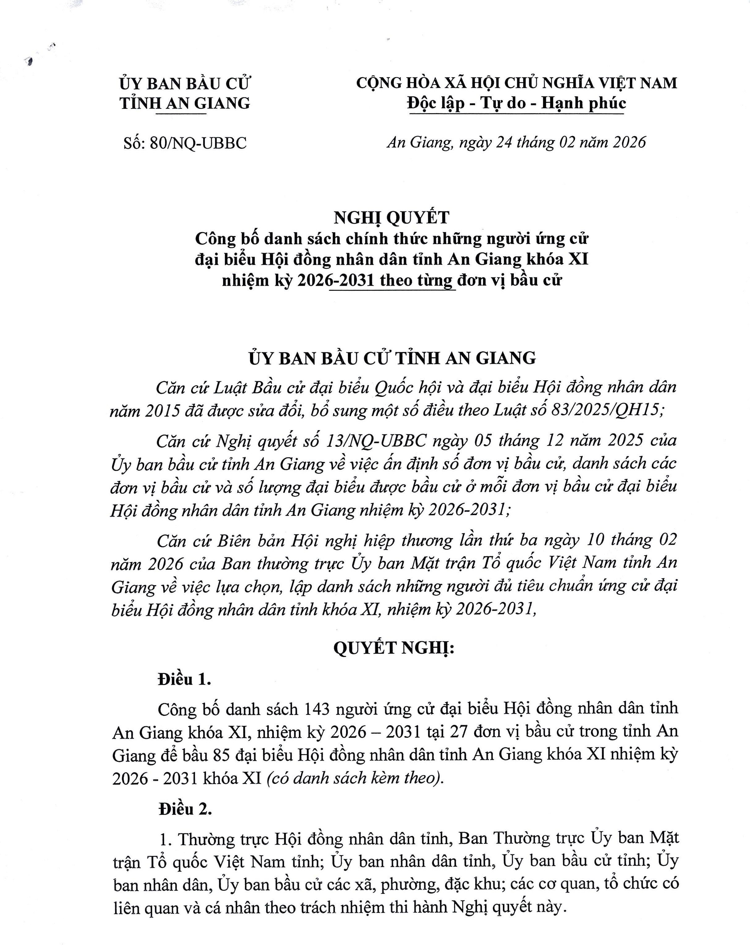 (Cổng TTĐT tỉnh AG)-Ngày 24/02/2026, Ủy ban Bầu cử tỉnh An Giang ban hành Nghị quyết số 80/NQ-UBBC công bố danh sách chính thức những người ứng cử đại biểu Hội đồng nhân dân tỉnh An Giang khóa XI nhiệm kỳ 2026-2031, theo từng đơn vị bầu cử.