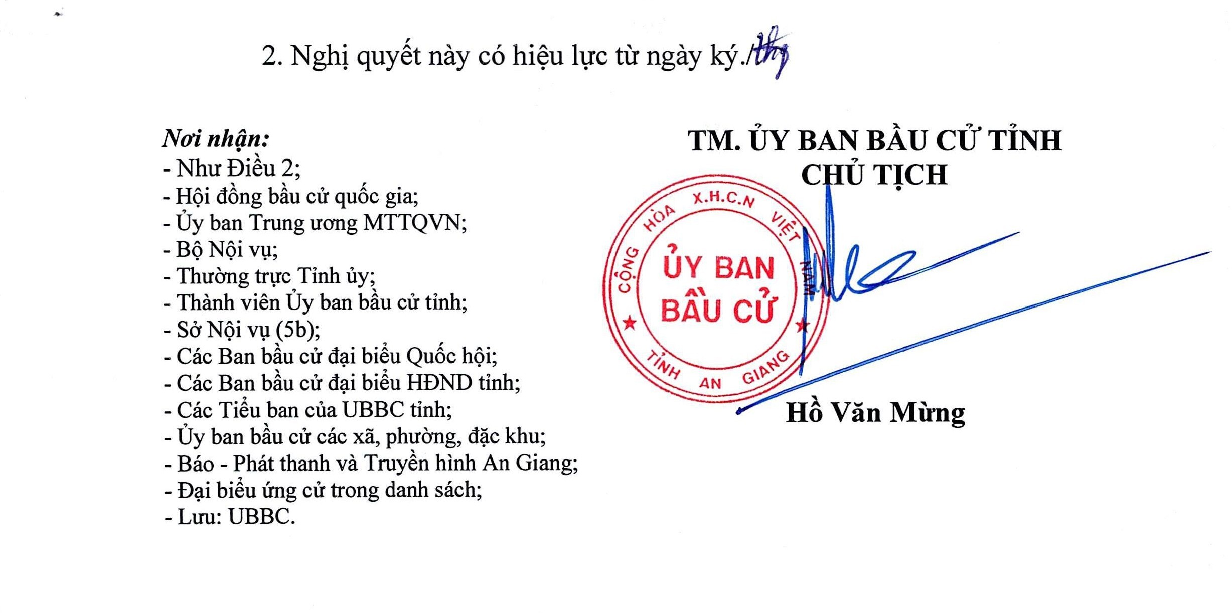 Theo Nghị quyết, công bố danh sách 143 người ứng cử đại biểu Hội đồng nhân dân tỉnh An Giang khóa XI, nhiệm kỳ 2026 – 2031 tại 27 đơn vị bầu cử trong tỉnh An Giang để bầu 85 đại biểu Hội đồng nhân dân tỉnh An Giang khóa XI nhiệm kỳ 2026 - 2031 (có danh sách kèm theo).