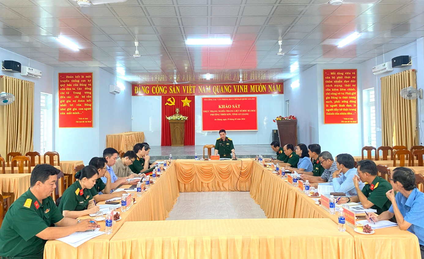 (Cổng TTĐT tỉnh AG)- Chiều 29/01, Đoàn công tác của Văn phòng Ban Chỉ đạo quốc gia 515 do Đại tá Lê Văn Sơn – Phó Cục trưởng Cục Chính sách - Xã hội (Tổng cục Chính trị), Phó Chánh Văn phòng Ban Chỉ đạo quốc gia 515 làm trưởng đoàn, đã có buổi làm việc và khảo sát thực tế tại Nghĩa trang Liệt sĩ Dốc Bà Đắc (địa phận thuộc phường Thới Sơn, tỉnh An Giang).