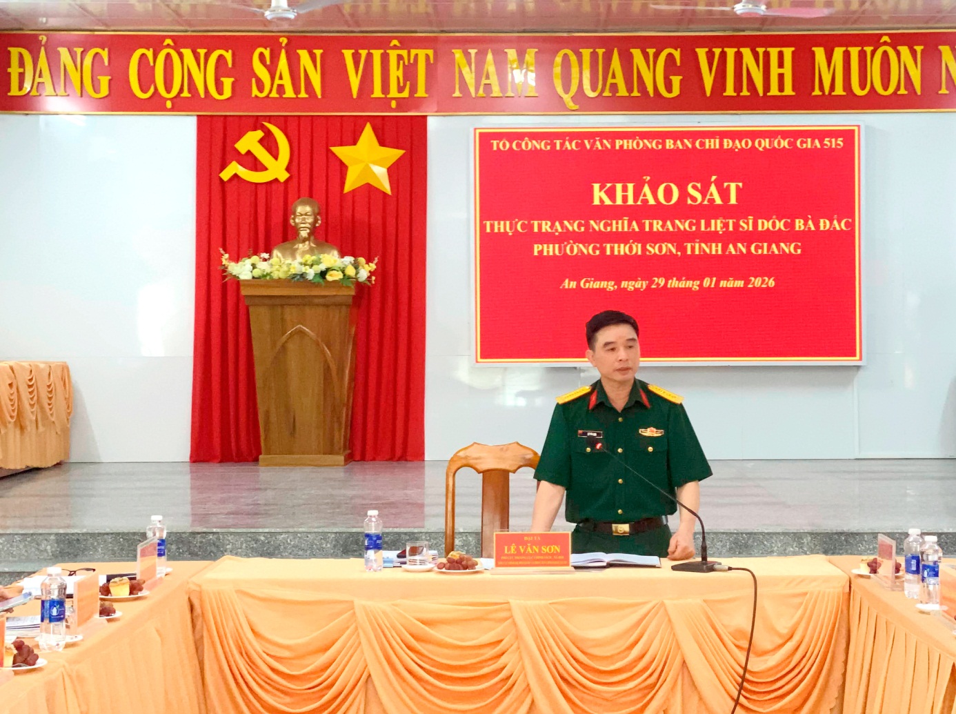 Qua khảo sát thực tế, Đại tá Lê Văn Sơn và đoàn công tác đã ghi nhận những nỗ lực của tỉnh An Giang trong công tác chăm sóc, quản lý nghĩa trang và quy tập hài cốt liệt sĩ. Đoàn cũng lắng nghe những khó khăn, vướng mắc từ thực tiễn địa phương, nhiều hài cốt liệt sĩ an táng trên 40 năm khiến chất lượng mẫu sinh phẩm giảm, ảnh hưởng kết quả giám định AND. Qua tiếp thu các kiến nghị, Ban Chỉ đạo sẽ có những định hướng, giải pháp phù hợp, hiệu quả nhằm sớm xác định danh tính các anh hùng liệt sĩ, đáp ứng mong mỏi của thân nhân và gia đình.