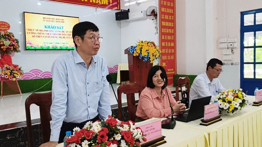(Cổng TTĐT tỉnh AG)- Ngày 17/11, Đoàn công tác Vụ Giáo dục Mầm non thuộc Bộ Giáo dục và Đào tạo phối hợp Sở Giáo dục và Đào tạo An Giang, tổ chức khảo sát thực tế và lấy ý kiến góp ý Dự thảo tài liệu tăng cường tiếng Việt trên cơ sở tiếng mẹ đẻ cho trẻ em 5 tuổi người dân tộc thiểu số tại các xã An Cư, Núi Cấm và phường Chi Lăng. Tiếp và làm việc với đoàn có Phó Chủ tịch UBND xã An Cư Lâm Văn Bá.