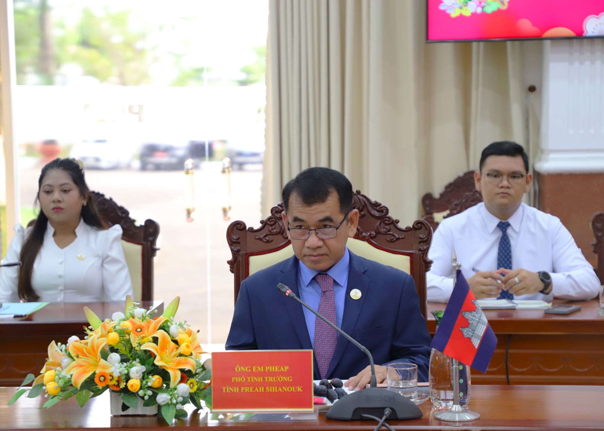 Nhân dịp đến thăm, Phó Tỉnh trưởng tỉnh Preah Sihanouk Em Pheap chúc mừng Đại hội đại biểu toàn quốc lần thứ XIV thành công tốt đẹp. Phó Tỉnh trưởng tỉnh Preah Sihanouk khẳng định, Campuchia xem trọng mối quan hệ thân thiết và hợp tác toàn diện giữa 02 nước, vốn đã và đang phát triển trên mọi lĩnh vực, mọi cấp độ, trên tinh thần “láng giềng tốt, tình hữu nghị truyền thống, hợp tác toàn diện và bền vững lâu dài". Trên cơ sở tình hữu nghị truyền thống lâu đời giữa hai nước, Preah Sihanouk và tỉnh An Giang (trước đây là tỉnh Kiên Giang) đã thiết lập quan hệ hữu nghị và ký kết Biên bản ghi nhớ về việc thành lập quan hệ hữu nghị giữa hai tỉnh từ năm 2005. Hai bên đã tăng cường thực hiện việc thúc đẩy quan hệ hữu nghị nhân dân và giao lưu hợp tác trong các lĩnh vực trọng điểm bao gồm quy tập hài cốt, công tác kinh tế, thương mại, giáo dục, văn hóa, du lịch, y tế, nông nghiệp và các hội liên hiệp phụ nữ.