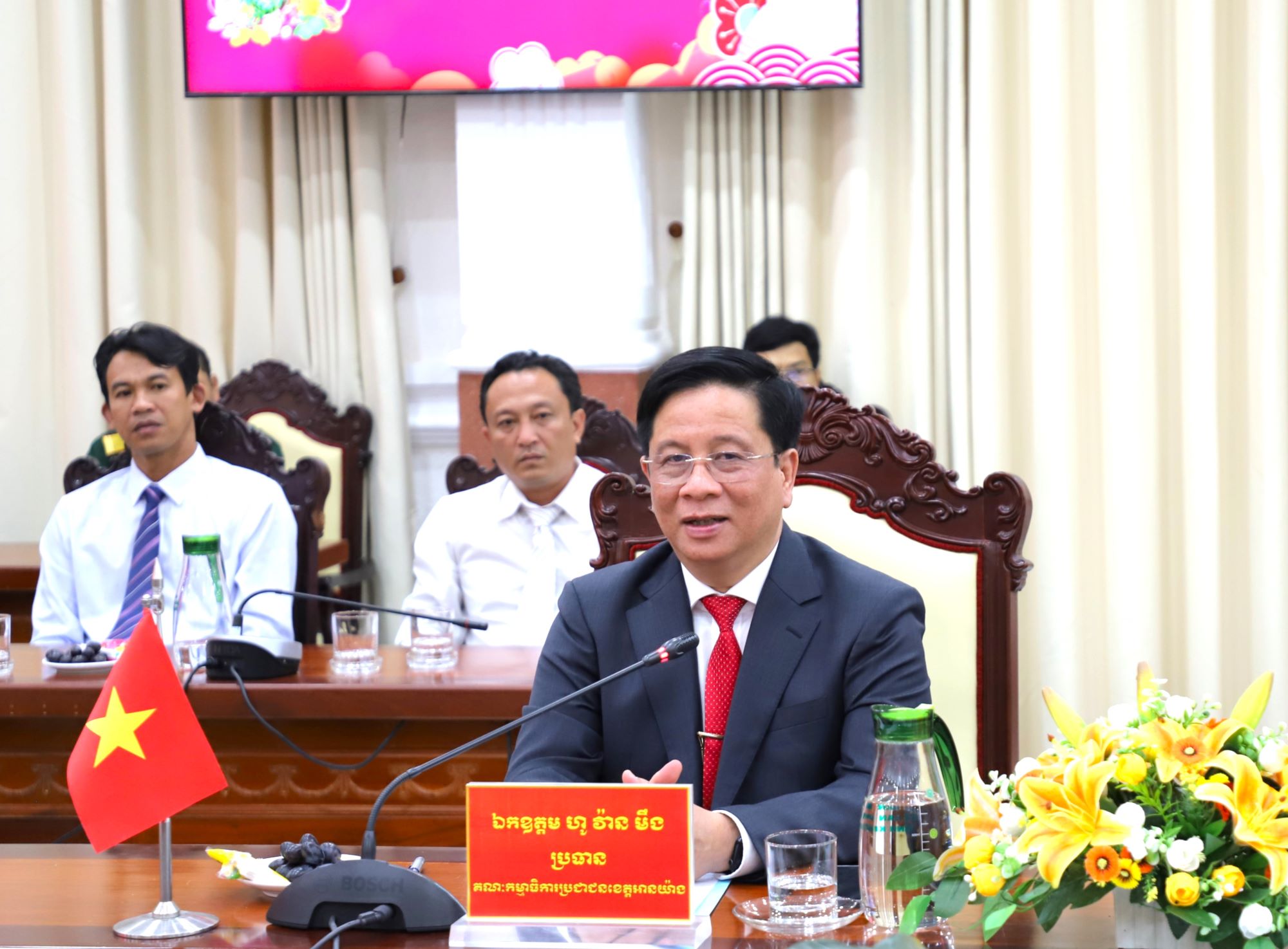 Phát biểu tại buổi đón tiếp, Chủ tịch UBND tỉnh An Giang Hồ Văn Mừng trân trọng cảm ơn tình cảm của ngài tỉnh trưởng, chính quyền và nhân dân tỉnh Takeo dành cho Đảng bộ, chính quyền và nhân dân tỉnh An Giang nhân dịp Tết cổ truyền của dân tộc Việt Nam đã có chuyến sang thăm, chúc Tết. Đồng thời, cảm ơn tỉnh Takeo đã quan tâm, hỗ trợ lực lượng tỉnh An Giang trong công tác tìm kiếm, quy tập và hồi hương hài cốt liệt sĩ quân tình nguyện và chuyên gia Việt Nam hy sinh tại Campuchia.