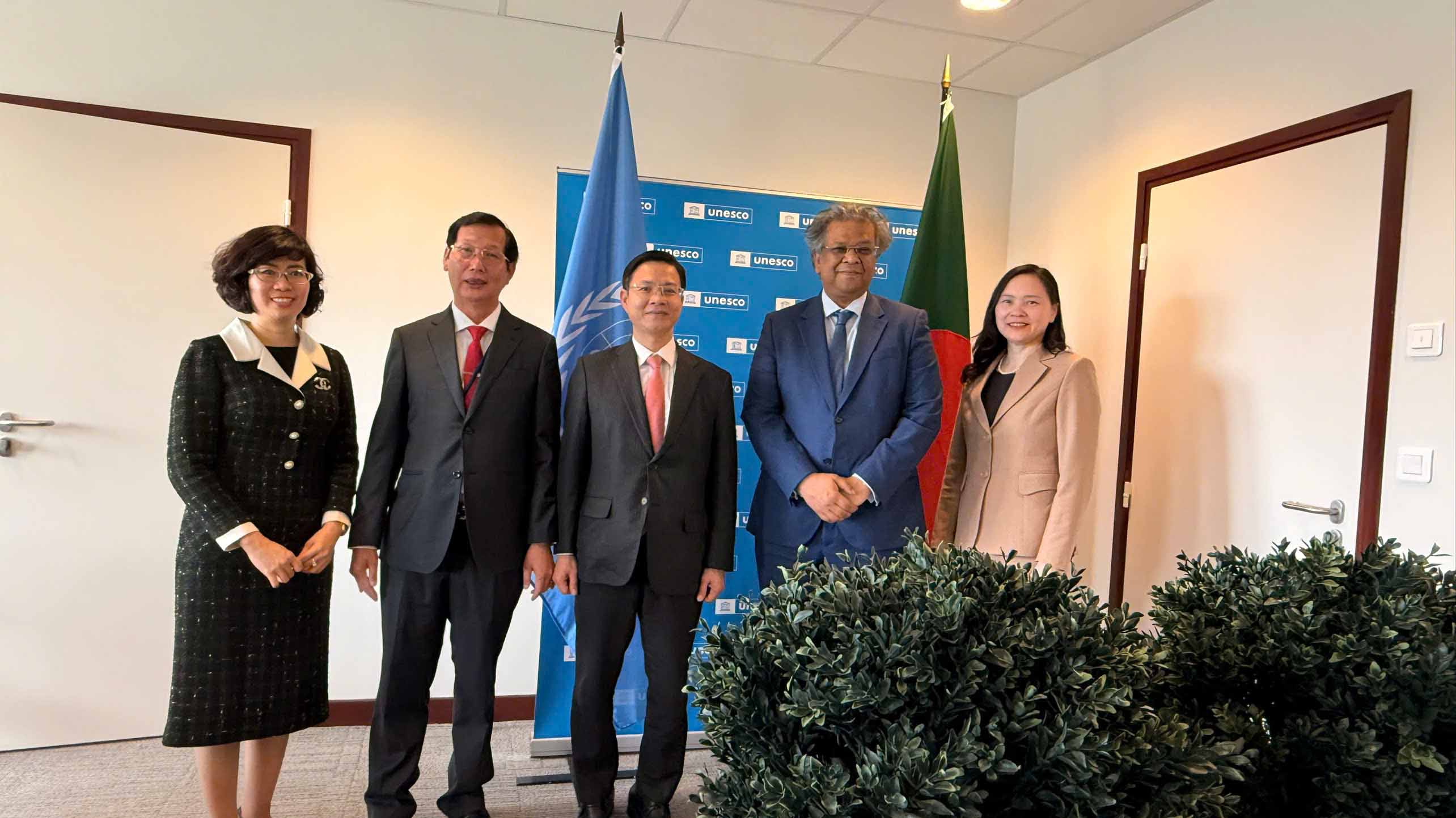 Dịp này, Đoàn cũng đến thăm, chào xã giao Chủ tịch Đại hội đồng Unesco (Đại sứ, Trưởng Phái đoàn đại diện Bangladesh bên cạnh UNESCO) Khondker M. Talha./.