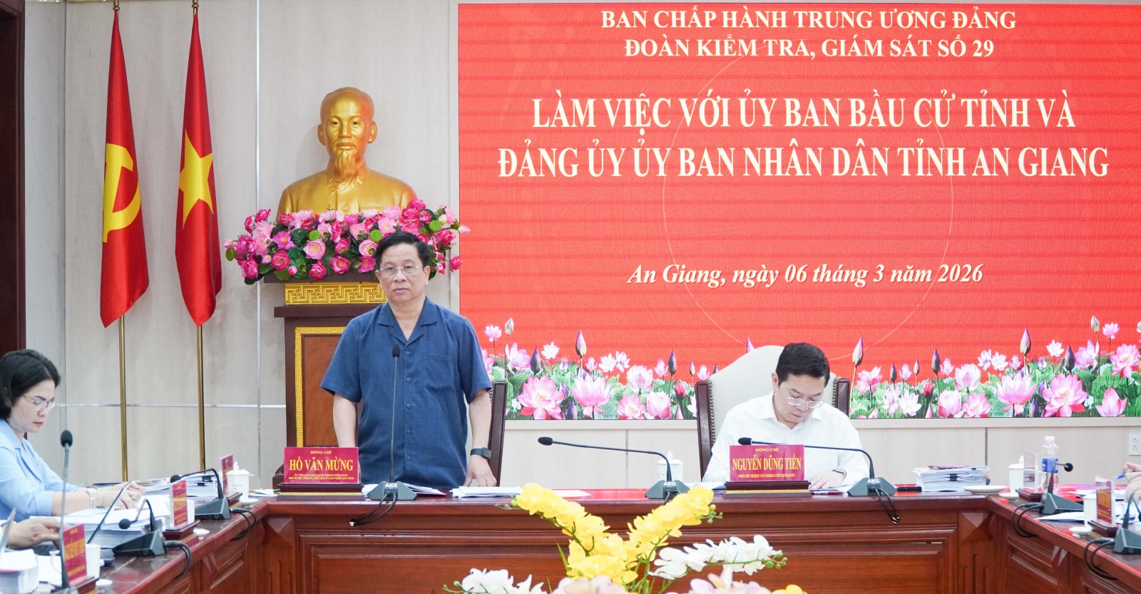 (Cổng TTĐT tỉnh AG)- Sáng 06/3, Đoàn Kiểm tra, giám sát số 29 của Bộ Chính trị, Ban Bí thư, do Phó Chủ nhiệm Văn phòng Chủ tịch nước Nguyễn Dũng Tiến làm phó trưởng đoàn có buổi làm việc với Ủy ban Bầu cử tỉnh và Đảng ủy UBND tỉnh An Giang. Tham dự buổi làm việc, phía tỉnh An Giang có Ủy viên Ban Chấp hành Trung ương Đảng, Phó Bí thư Tỉnh ủy, Chủ tịch UBND tỉnh Hồ Văn Mừng.