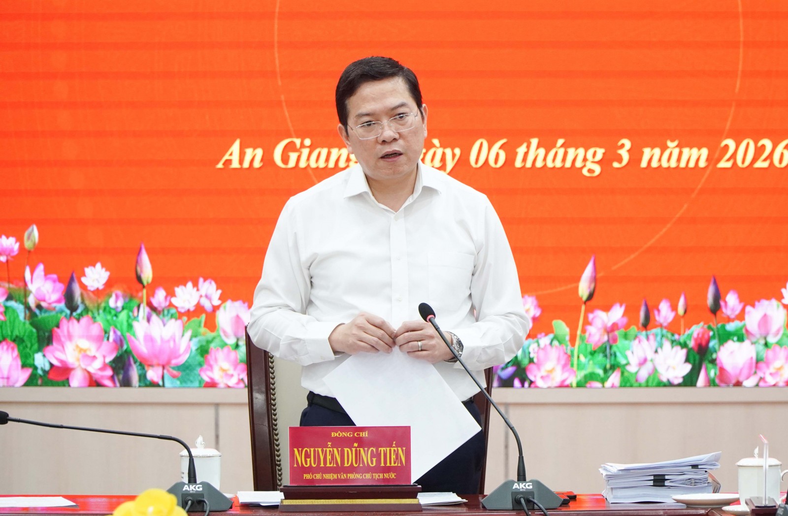 Phát biểu kết làm việc, Phó Chủ nhiệm Văn phòng Chủ tịch nước Nguyễn Dũng Tiến đánh giá cao Ban Thường vụ Tỉnh ủy, Ban Thường vụ Đảng ủy UBND tỉnh An Giang đã quan tâm lãnh đạo, chỉ đạo việc nghiên cứu, học tập, quán triệt và triển khai thực hiện Nghị quyết Đại hội XIV của Đảng và Chỉ thị số 01-CT/TW, Chỉ thị số 46-CT/TW của Bộ Chính trị nghiêm túc, kịp thời. Công tác bầu cử được triển khai nghiêm túc, bám sát các yêu cầu của Trung ương.