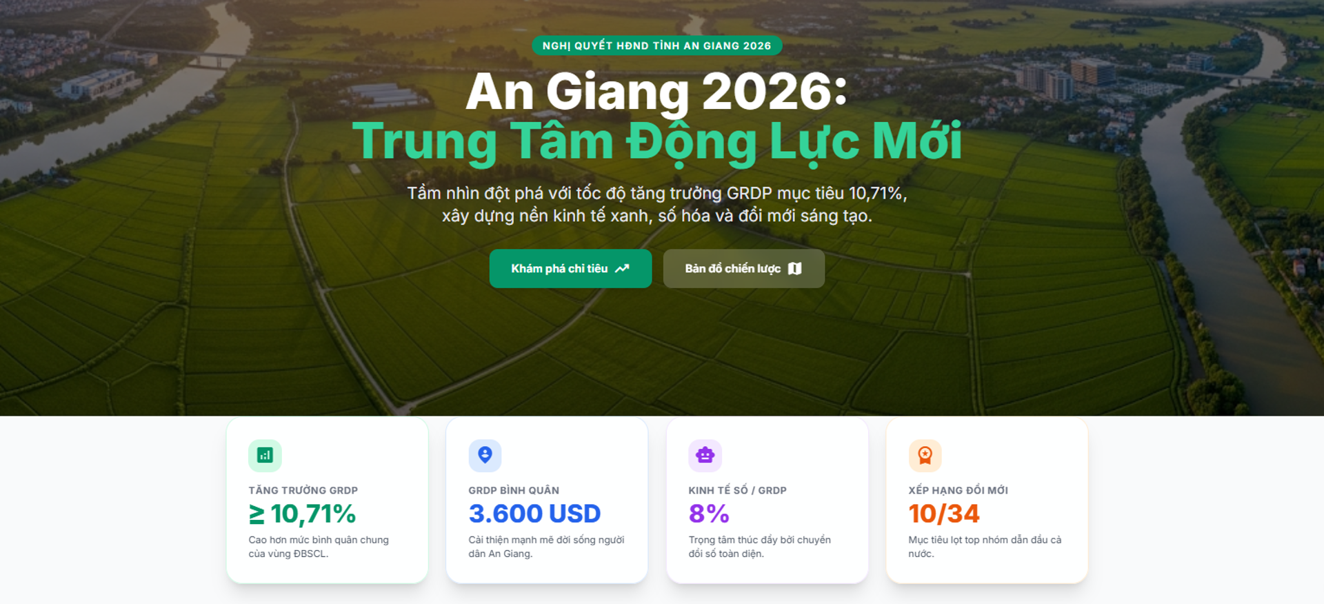 (Cổng TTĐT tỉnh AG)- Với mục tiêu tăng trưởng GRDP đạt từ 10,71% trở lên năm 2026, An Giang cần đẩy mạnh chuyển đổi số và đổi mới sáng tạo như động lực chính để hiện thực hóa khát vọng trở thành trung tâm động lực mới của vùng Đồng bằng sông Cửu Long.